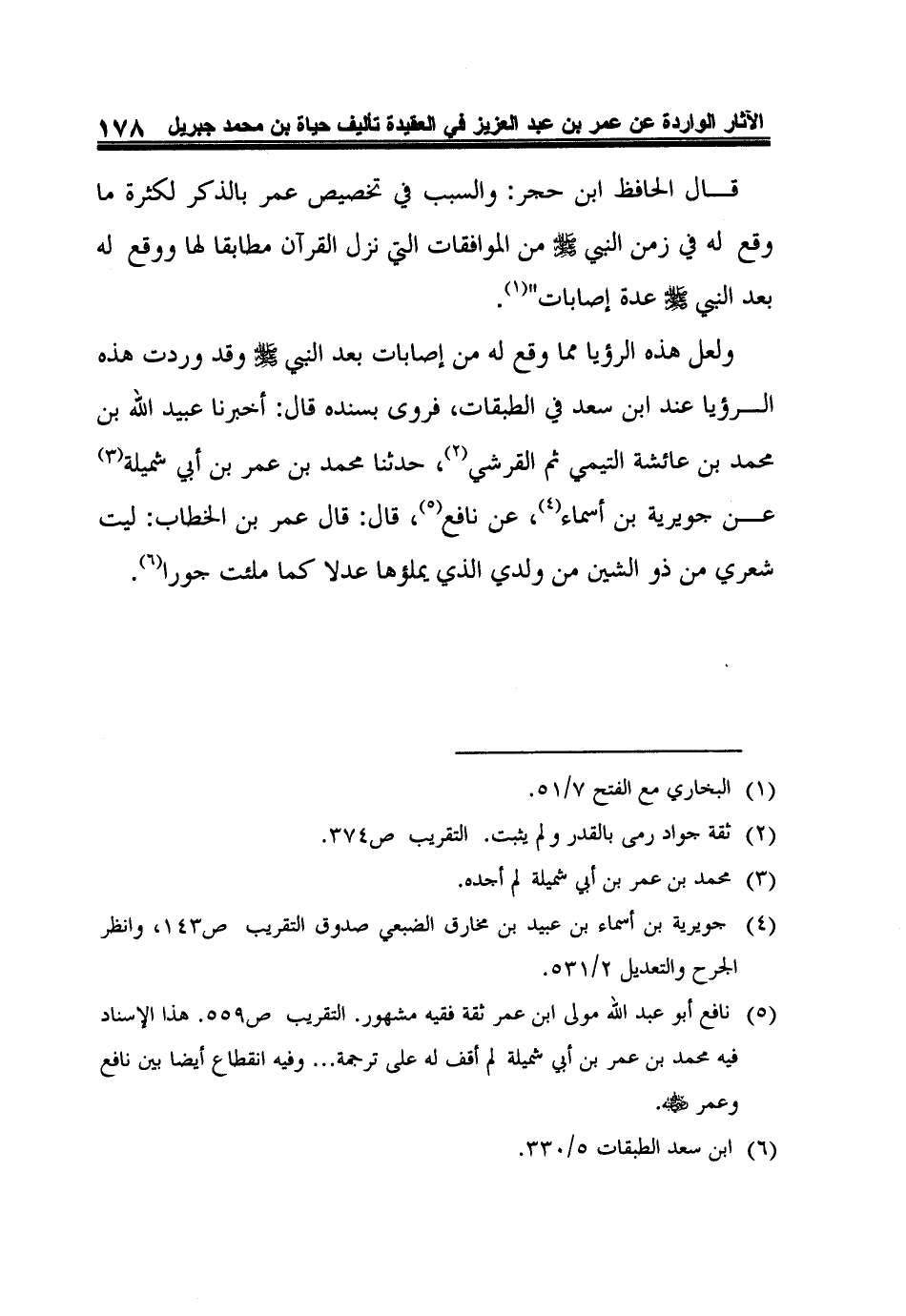 ولعل هذه الرؤيا مما وقع له من إصابات بعد النبي صلى الله عليه وسلم وقد وردت هذه الرؤيا عند ابن سعد في الطبقات، فروى بسنده قال: أخبرنا عبيد الله بن محمد بن عائشة التيمي ثم القرشي2، حدثنا محمد بن عمر بن أبي شميلة3 عن جويرية بن أسماء4، عن نافع5، قال: قال عمر بن الخطاب: ليت شعري من ذو الشين من ولدي الذي يملؤها عدلا كما ملئت جورا6.