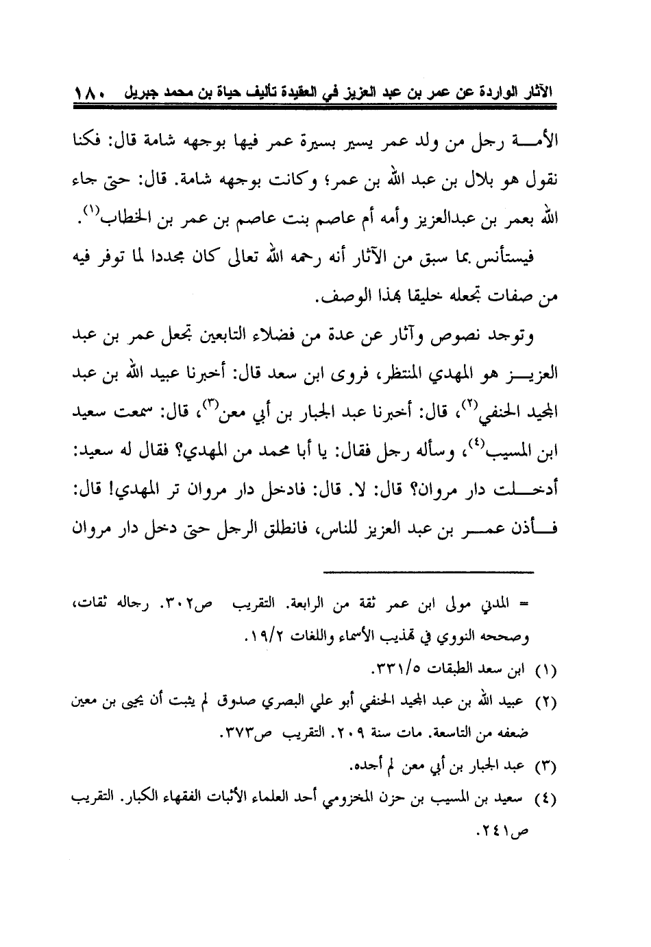 وتوجد نصوص وآثار عن عدة من فضلاء التابعين تجعل عمر بن عبد العزيز هو المهدي المنتظر، فروى ابن سعد قال: أخبرنا عبيد الله بن عبد المجيد الحنفي2، قال: أخبرنا عبد الجبار بن أبي معن3، قال: سمعت سعيد ابن المسيب4، وسأله رجل فقال: يا أبا محمد من المهدي؟ فقال له سعيد: أدخلت دار مروان؟ قال: لا. قال: فادخل دار مروان تر المهدي! قال: فأذن عمر بن عبد العزيز للناس، فانطلق الرجل حتى دخل دار مروان