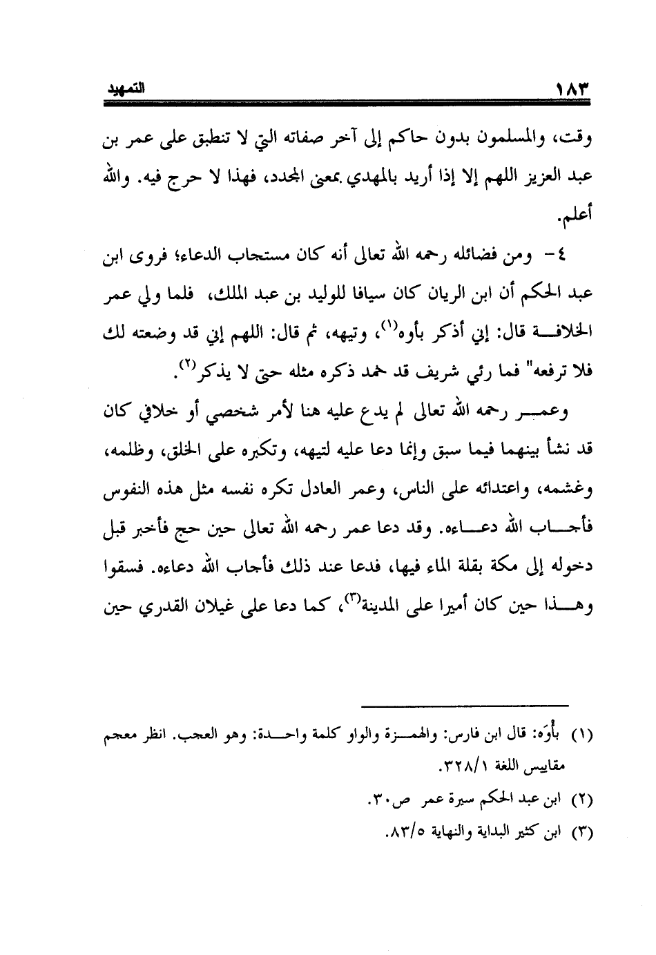 4- ومن فضائله رحمه الله تعالى أنه كان مستجاب الدعاء، فروى ابن عبد الحكم أن ابن الريان كان سيافا للوليد بن عبد الملك، فلما ولي عمر الخلافة قال: إني أذكر بأوه1، وتيهه، ثم قال: اللهم إني قد وضعته لك فلا ترفعه" فما رئي شريف قد خمد ذكره مثله حتى لا يذكر2.