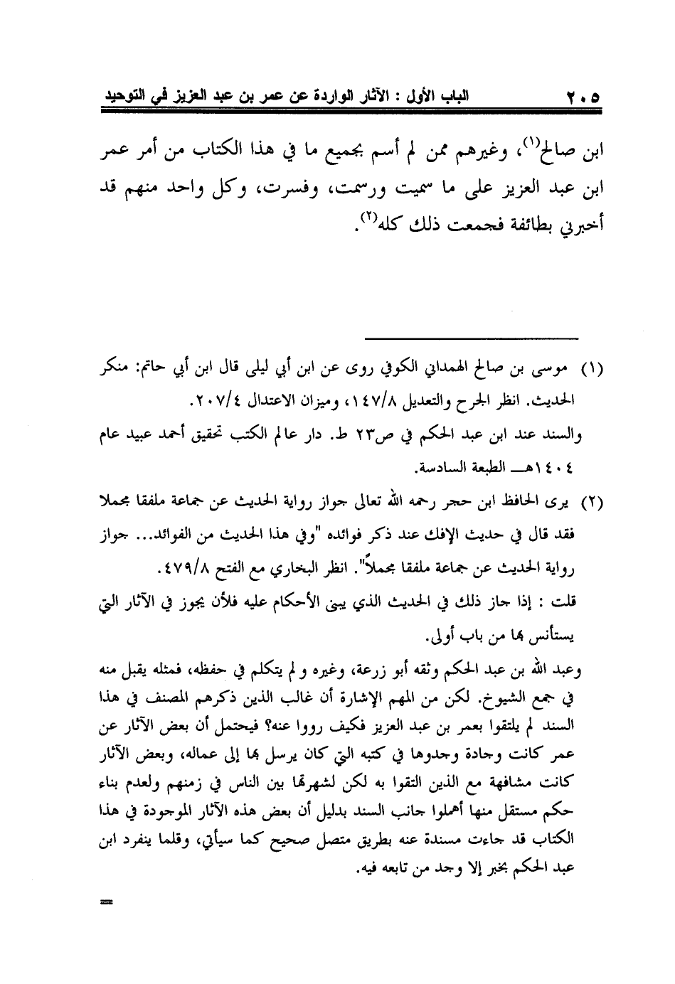 وعبد الله بن عبد الحكم وثقه أبو زرعة، وغيره ولم يتكلم في حفظه، فمثله يقبل منه في جمع الشيوخ. لكن من المهم الإشارة أن غالب الذين ذكرهم المصنف في هذا السند لم يلتقوا بعمر بن عبد العزيز فكيف رووا عنه؟ فيحتمل أن بعض الآثار عن عمر كانت وجادة وجدوها في كتبه التي كان يرسل بها إلى عماله، وبعض الآثار كانت مشافهة مع الذين التقوا به لكن لشهرتها بين الناس في زمنهم ولعدم بناء حكم مستقل منها أهملوا جانب السند بدليل أن بعض هذه الآثار الموجودة في هذا الكتاب قد جاءت مسندة عنه بطريق متصل صحيح كما سيأتي، وقلما ينفرد ابن عبد الحكم بخبر إلا وجد من تابعه فيه.