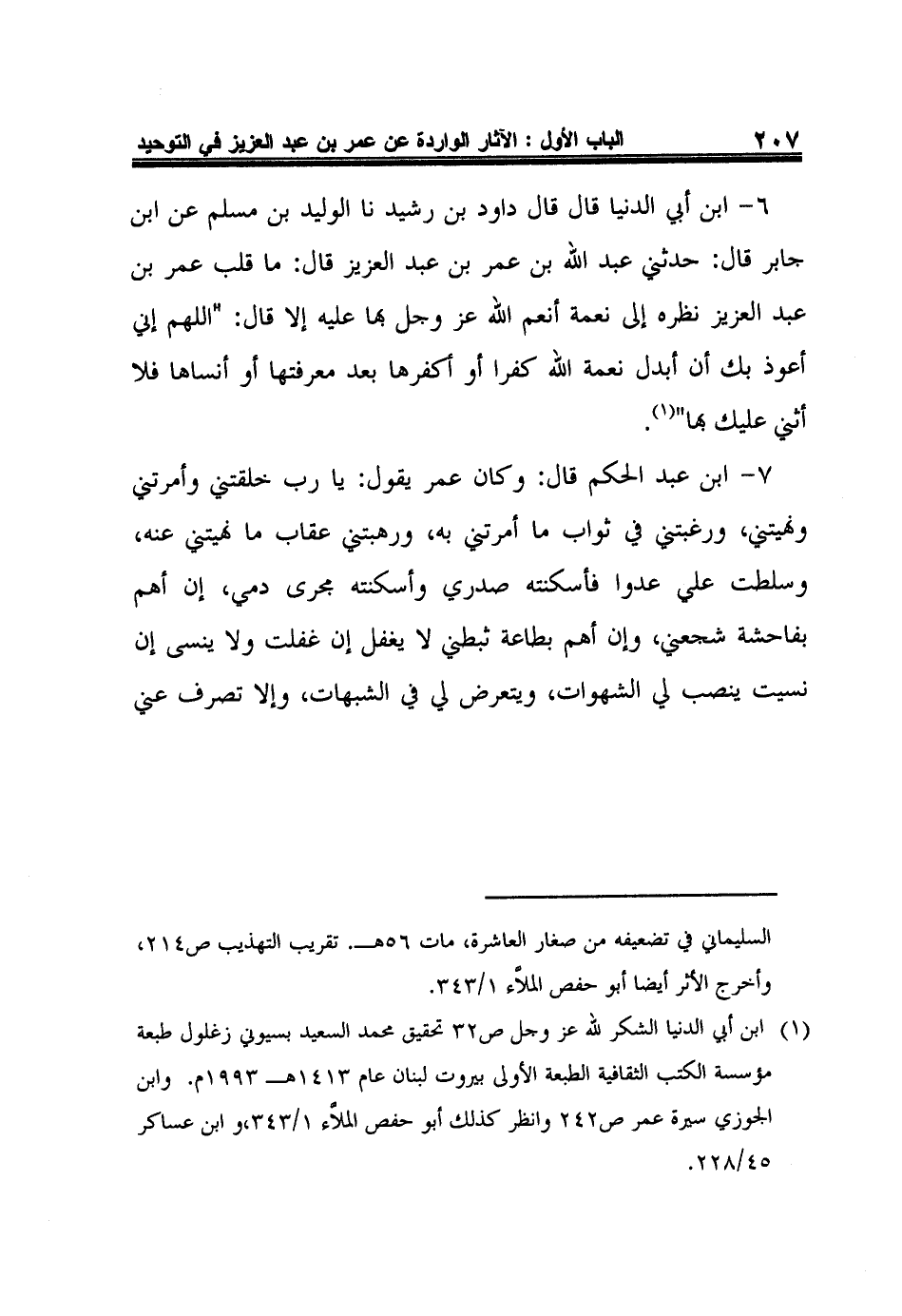 1 ابن أبي الدنيا الشكر لله عز وجل ص32 تحقيق محمد السعيد بسيوني زغلول طبعة مؤسسة الكتب الثقافية الطبعة الأولى بيروت لبنان عام 1413هـ - 1993م. وابن الجوزي سيرة عمر ص242 وانظر كذلك أبو حفص الملاَّء 1/343،وابن عساكر 45/228.
