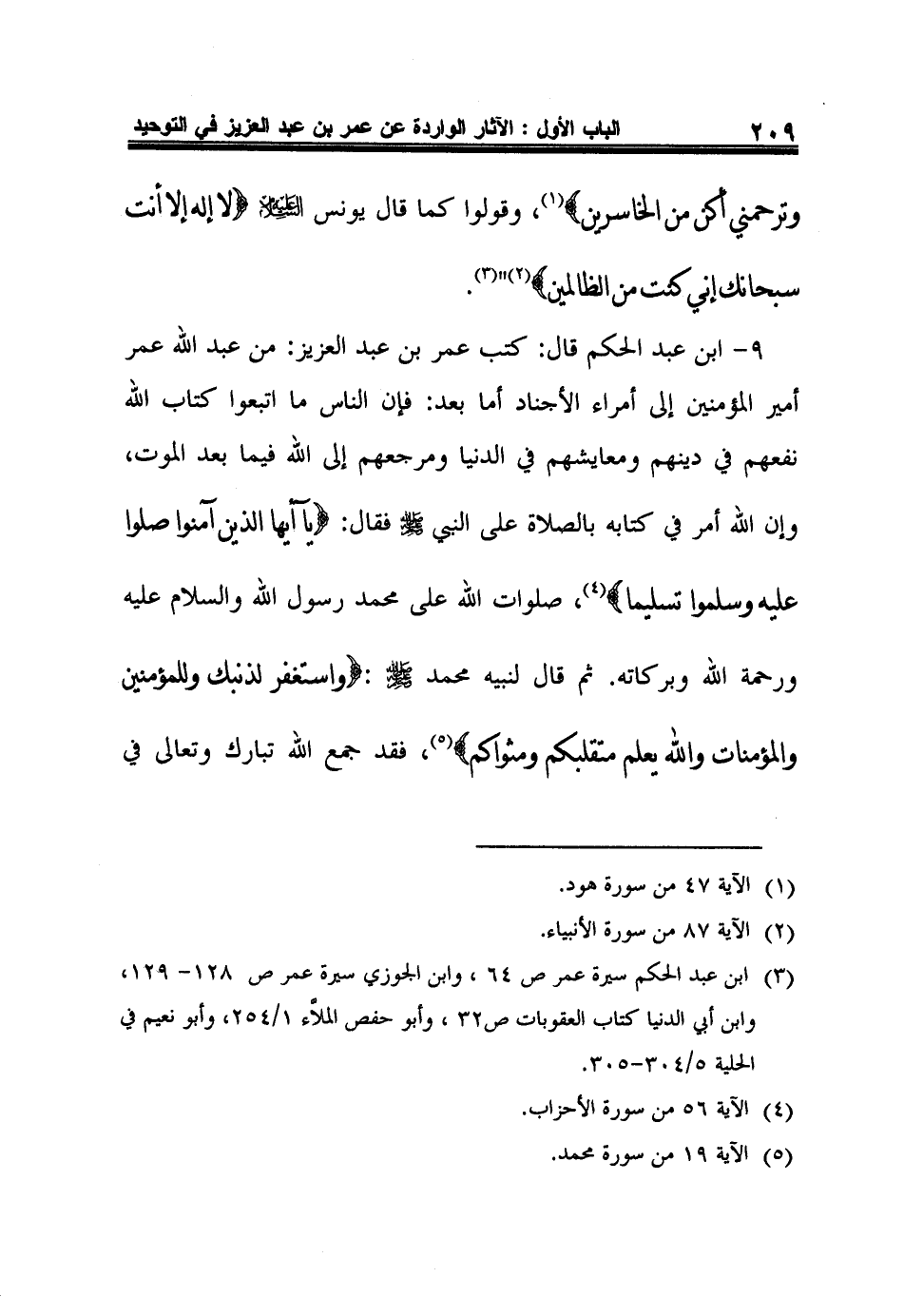 9- ابن عبد الحكم قال: كتب عمر بن عبد العزيز: من عبد الله عمر أمير المؤمنين إلى أمراء الأجناد أما بعد: فإن الناس ما اتبعوا كتاب الله نفعهم في دينهم ومعايشهم في الدنيا ومرجعهم إلى الله فيما بعد الموت، وإن الله أمر في كتابه بالصلاة على النبي صلى الله عليه وسلم فقال: {يَا أَيُّهَا الَّذِينَ آمَنُوا صَلُّوا عَلَيْهِ وَسَلِّمُوا تَسْلِيماً} 4، صلوات الله على محمد رسول الله والسلام عليه ورحمة الله وبركاته. ثم قال لنبيه محمد صلى الله عليه وسلم: {وَاسْتَغْفِرْ لِذَنْبِكَ وَلِلْمُؤْمِنِينَ وَالْمُؤْمِنَاتِ وَاللَّهُ يَعْلَمُ مُتَقَلَّبَكُمْ وَمَثْوَاكُمْ} 5، فقد جمع الله تبارك وتعالى في
