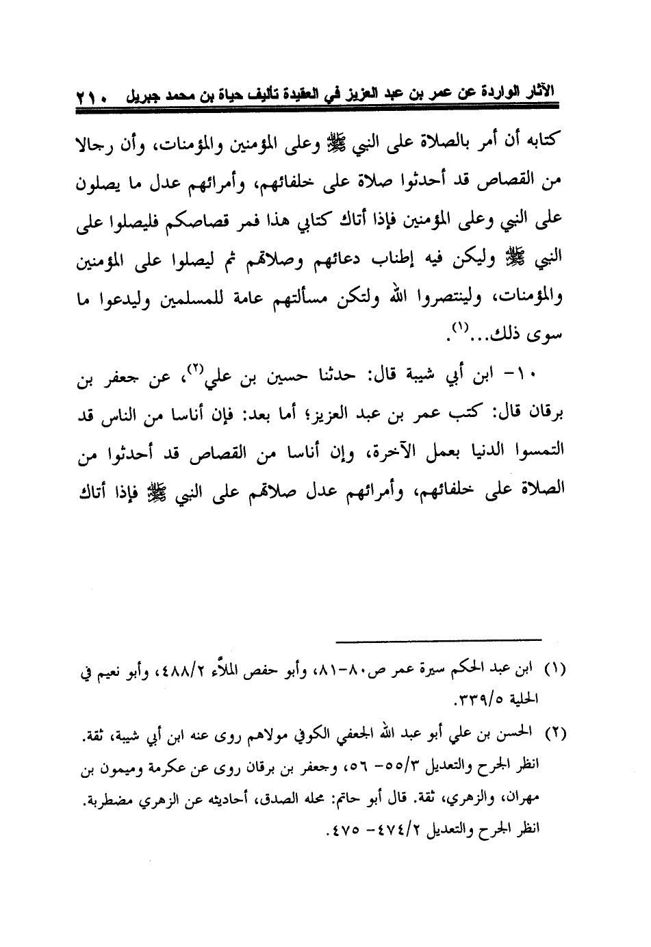 10- ابن أبي شيبة قال: حدثنا حسين بن علي2، عن جعفر بن برقان قال: كتب عمر بن عبد العزيز، أما بعد: فإن أناسا من الناس قد التمسوا الدنيا بعمل الآخرة، وإن أناسا من القصاص قد أحدثوا من الصلاة على خلفائهم، وأمرائهم عدل صلاتهم على النبي صلى الله عليه وسلم فإذا أتاك