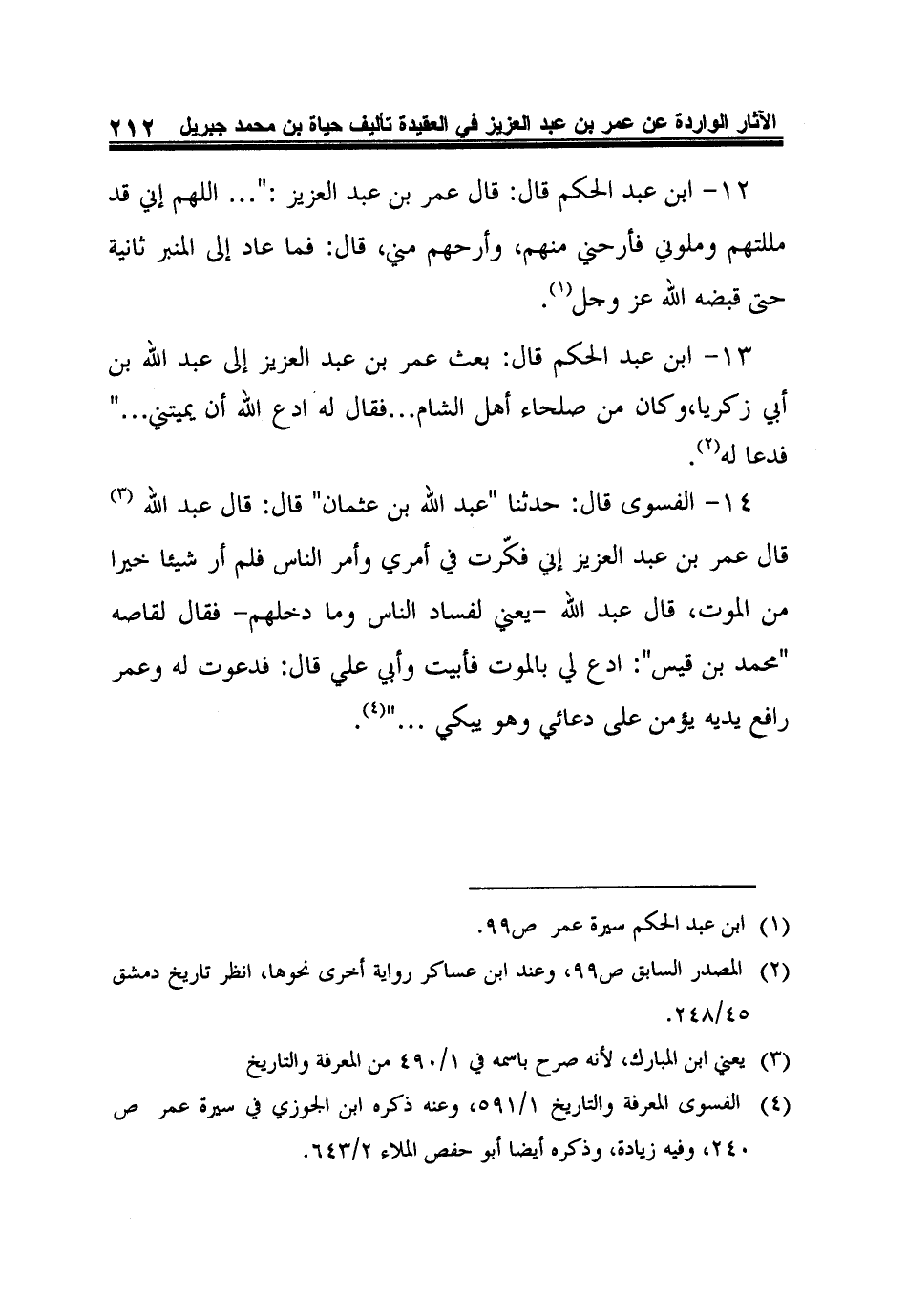 14- الفسوي قال: حدثنا "عبد الله بن عثمان" قال: قال عبد الله 3 قال عمر بن عبد العزيز: إني فكّرت في أمري وأمر الناس فلم أر شيئا خيرا من الموت، قال عبد الله - يعني لفساد الناس وما دخلهم - فقال لقاصه "محمد بن قيس": ادع لي بالموت فأبيت وأبي علي قال: فدعوت له وعمر رافع يديه يؤمن على دعائي وهو يبكي ... "4.