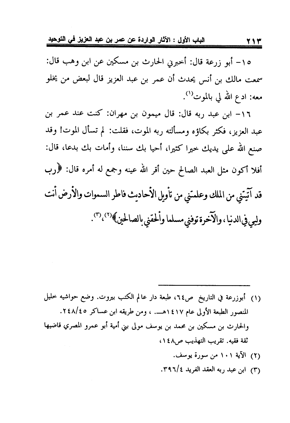 15- أبو زرعة قال: أخبرني الحارث بن مسكين عن ابن وهب قال: سمعت مالك بن أنس يحدث أن عمر بن عبد العزيز قال لبعض من يخلو معه: ادع الله لي بالموت1.