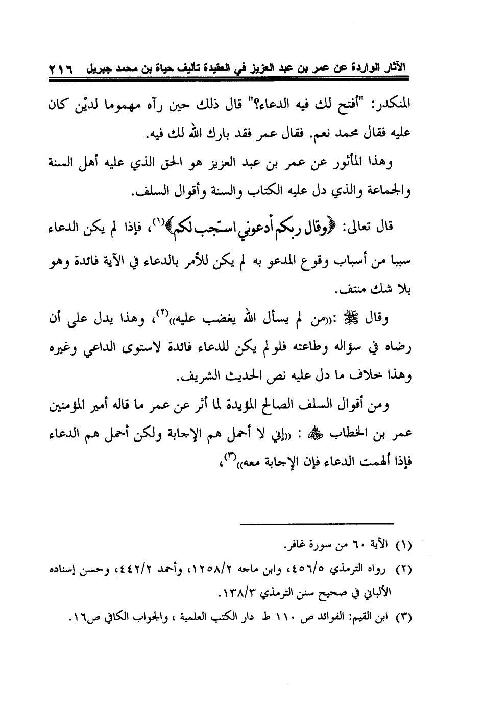 وقال صلى الله عليه وسلم: "من لم يسأل الله يغضب عليه"2، وهذا يدل على أن رضاه في سؤاله وطاعته فلولم يكن للدعاء فائدة لاستوى الداعي وغيره وهذا خلاف ما دل عليه نص الحديث الشريف.