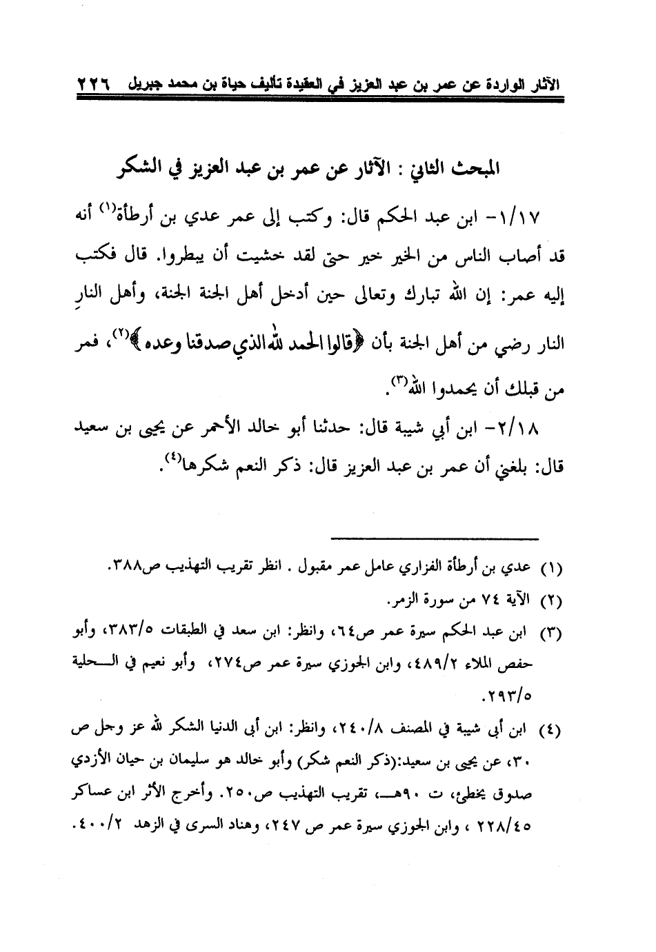 18/2- ابن أبي شيبة قال: حدثنا أبو خالد الأحمر عن يحيى بن سعيد قال: بلغني أن عمر بن عبد العزيز قال: ذكر النعم شكرها4.