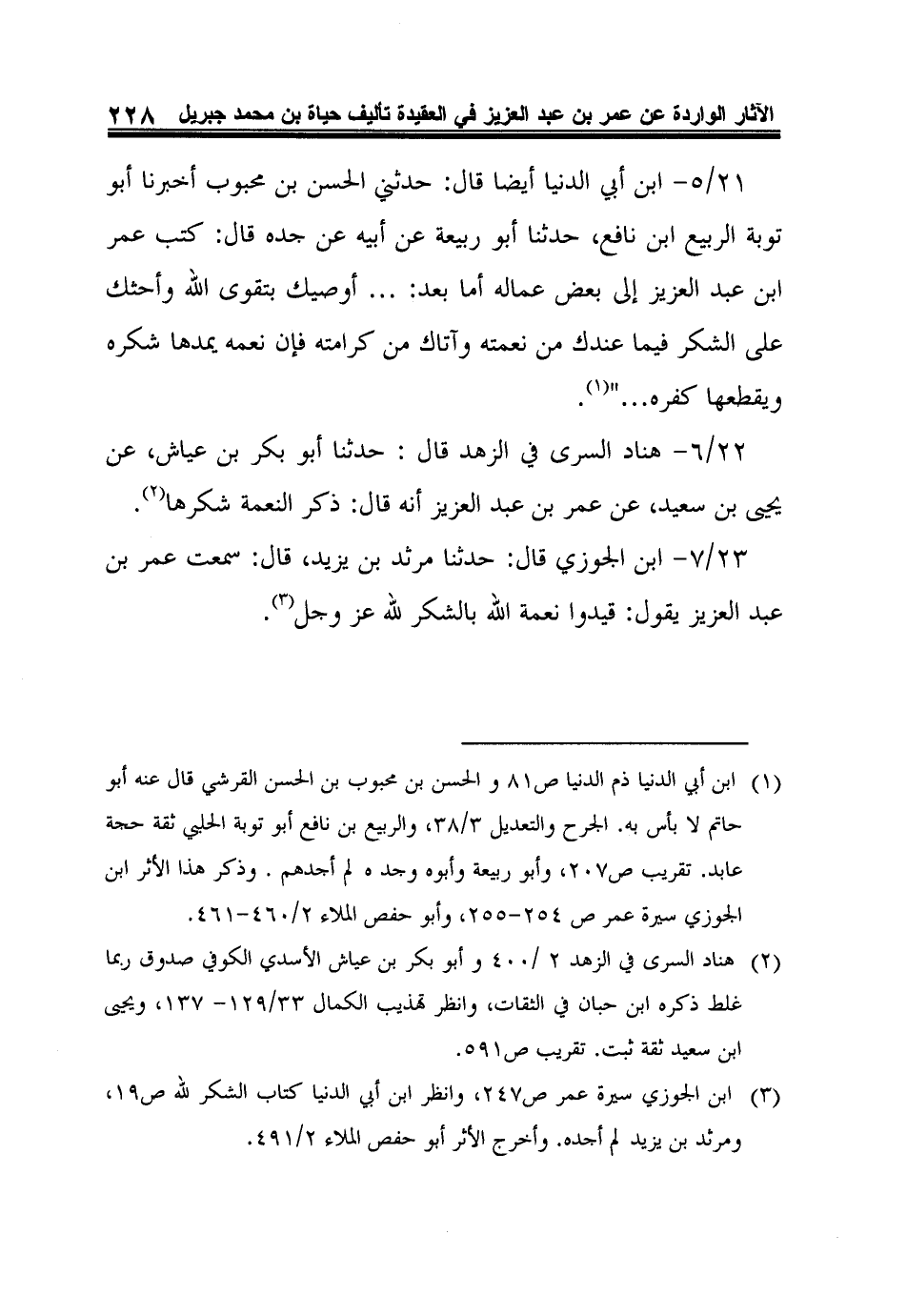 23/7- ابن الجوزي قال: حدثنا مرثد بن يزيد، قال: سمعت عمر بن عبد العزيز يقول: قيدوا نعمة الله بالشكر لله عز وجل3.
