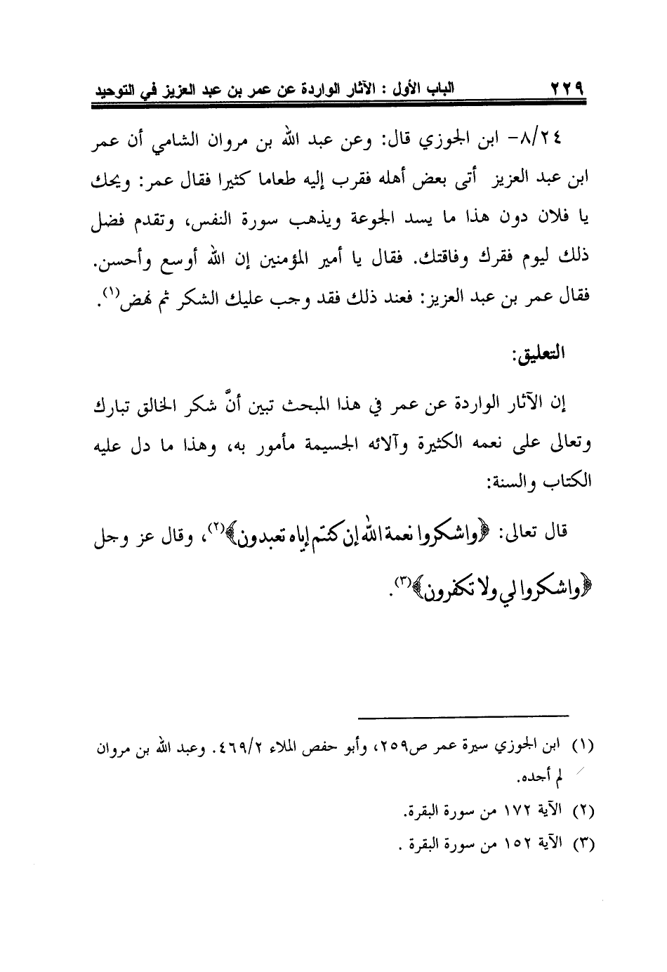 24/8- ابن الجوزي قال: وعن عبد الله بن مروان الشامي أن عمر ابن عبد العزيز أتى بعض أهله فقرب إليه طعاما كثيرا فقال عمر: ويحك يا فلان دون هذا ما يسد الجوعة ويذهب سورة النفس، وتقدم فضل ذلك ليوم فقرك وفاقتك. فقال يا أمير المؤمنين إن الله أوسع وأحسن. فقال عمر بن عبد العزيز: فعند ذلك فقد وجب عليك الشكر ثم نهض1.