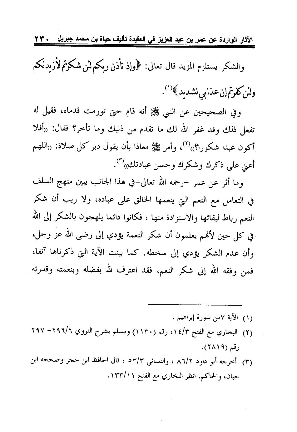 وفي الصحيحين عن النبي صلى الله عليه وسلم أنه قام حتى تورمت قدماه، فقيل له تفعل ذلك وقد غفر الله لك ما تقدم من ذنبك وما تأخر؟ فقال: "أفلا أكون عبدا شكورا؟ "2، وأمر صلى الله عليه وسلم معاذا بأن يقول دبر كل صلاة: "اللهم أعني على ذكرك وشكرك وحسن عبادتك" 3.
