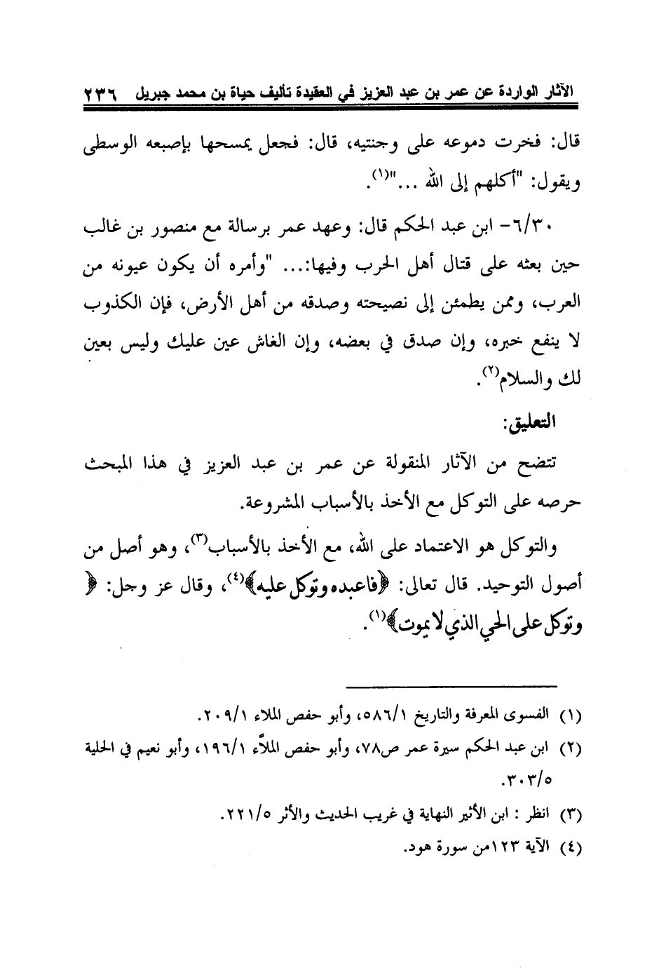 تتضح من الآثار المنقولة عن عمر بن عبد العزيز في هذا المبحث حرصه على التوكل مع الأخذ بالأسباب المشروعة.