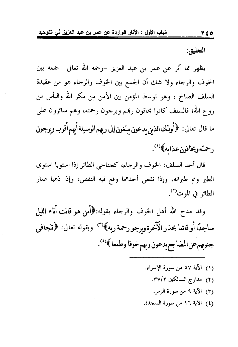 يظهر مما أثر عن عمر بن عبد العزيز -رحمه الله تعالى- جمعه بين الخوف والرجاء ولا شك أن الجمع بين الخوف والرجاء هو من عقيدة السلف الصالح، وهو توسط المؤمن بين الأمن من مكر الله واليأس من روح الله، فالسلف كانوا يخافون ربهم ويرجون رحمته، وهم سائرون على ما قال تعالى: {أُولَئِكَ الَّذِينَ يَدْعُونَ يَبْتَغُونَ إِلَى رَبِّهِمُ الْوَسِيلَةَ أَيُّهُمْ أَقْرَبُ وَيَرْجُونَ رَحْمَتَهُ وَيَخَافُونَ عَذَابَهُ} 1.
