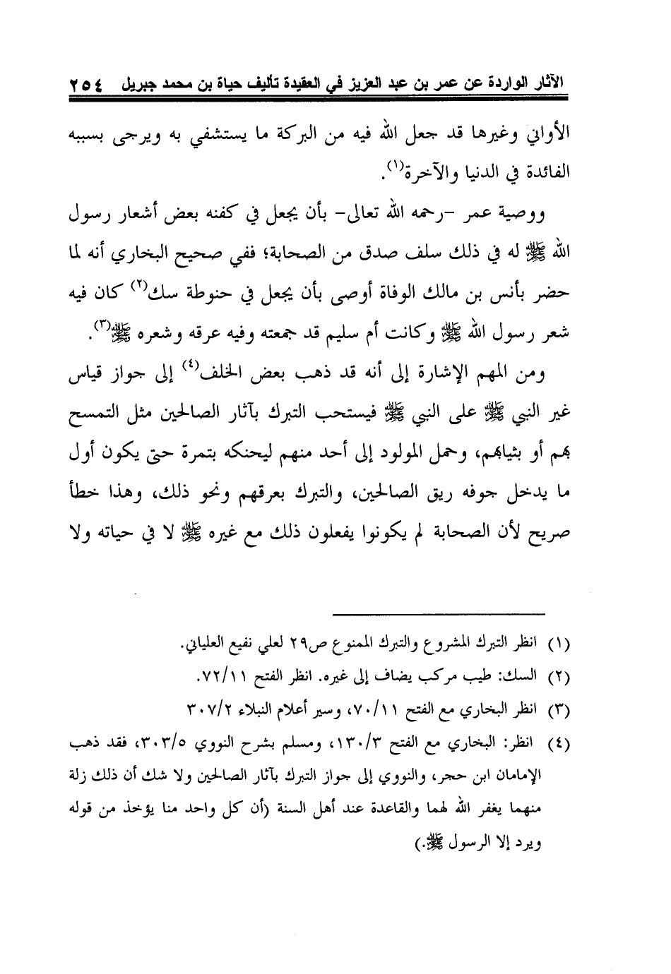 4 انظر: البخاري مع الفتح 3/130، ومسلم بشرح النووي 5/303، فقد ذهب الإمامان ابن حجر، والنووي إلى جواز التبرك بآثار الصالحين ولا شك أن ذلك زلة منهما يغفر الله لهما والقاعدة عند أهل السنة (أن كل واحد منا يؤخذ من قوله ويرد إلا الرسول صلى الله عليه ويسلم) .