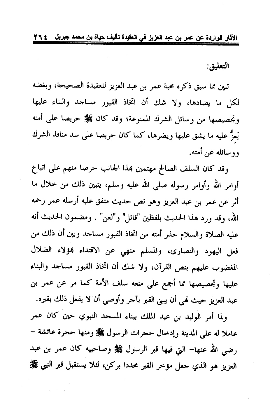 وقد كان السلف الصالح مهتمين بهذا الجانب حرصا منهم على اتباع أوامر الله وأوامر رسوله صلى الله عليه وسلم، يتبين ذلك من خلال ما أثر عن عمر بن عبد العزيز وهو نص حديث متفق عليه أرسله عمر رحمه الله، وقد ورد هذا الحديث بلفظين "قاتل" و"لعن". ومضمون الحديث أنه عليه الصلاة والسلام حذر أمته من اتخاذ القبور مساجد وبين أن ذلك من فعل اليهود والنصارى، والمسلم منهي عن الاقتداء بهؤلاء الضلال المغضوب عليهم بنص القرآن، ولا شك أن اتخاذ القبور مساجد والبناء عليها وتجصيصها مما أجمع على منعه سلف الأمة كما مر عن عمر بن عبد العزيز حيث نهى أن يبنى القبر بآجر وأوصى أن لا يفعل ذلك بقبره.