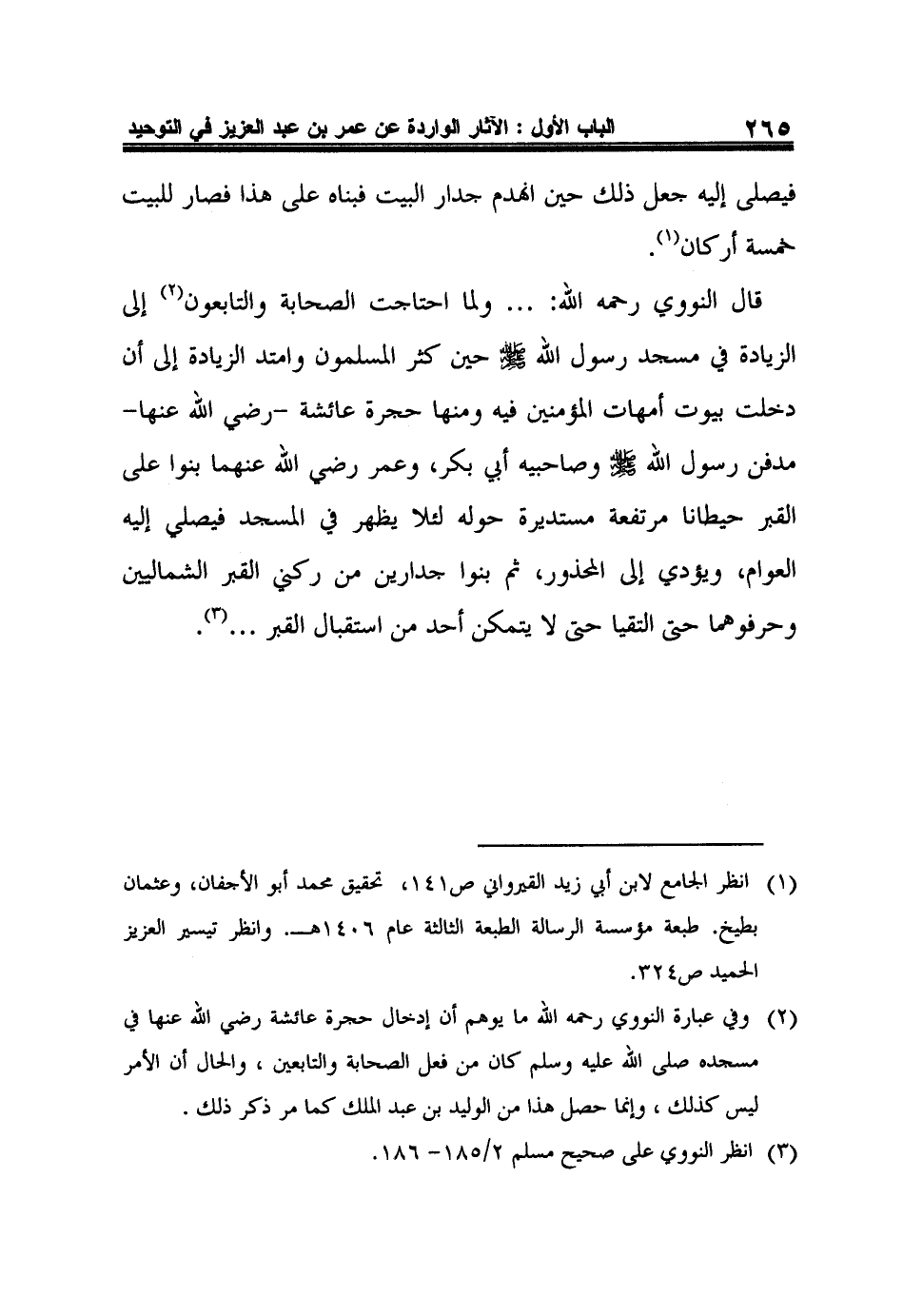 2 وفي عبارة النووي رحمه الله ما يوهم أن إدخال حجرة عائشة رضي الله عنها في مسجده صلى الله عليه وسلم كان من فعل الصحابة والتابعين، والحال أن الأمر ليس كذلك، وإنما حصل هذا من الوليد بن عبد الملك كما مر ذكر ذلك.