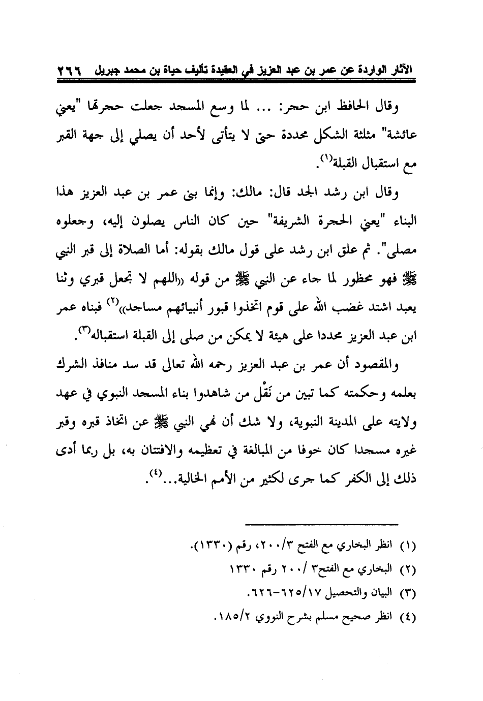 والمقصود أن عمر بن عبد العزيز رحمه الله تعالى قد سد منافذ الشرك بعلمه وحكمته كما تبين من نَقْل من شاهدوا بناء المسجد النبوي في عهد ولايته على المدينة النبوية، ولا شك أن نهي النبي صلى الله عليه وسلم عن اتخاذ قبره وقبر غيره مسجدا كان خوفا من المبالغة في تعظيمه والافتتان به، بل ربما أدى ذلك إلى الكفر كما جرى لكثير من الأمم الخالية ... 3.