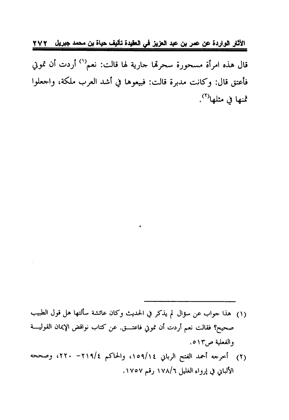 1 هذا جواب عن سؤال لم يذكر في الحديث وكان عائشة سألتها هل قول الطبيب صحيح؟ فقالت نعم أردت أن تموتي فاعتق. عن كتاب نواقض الإيمان القولية والفعلية ص513.