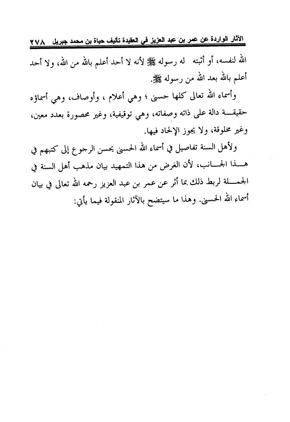 ولأهل السنة تفاصيل في أسماء الله الحسنى يحسن الرجوع إلى كتبهم في هذا الجانب، لأن الغرض من هذا التمهيد بيان مذهب أهل السنة في الجملة لربط ذلك بما أثر عن عمر بن عبد العزيز رحمه الله تعالى في بيان أسماء الله الحسنى. وهذا ما سيتضح بالآثار المنقولة فيما يأتي: