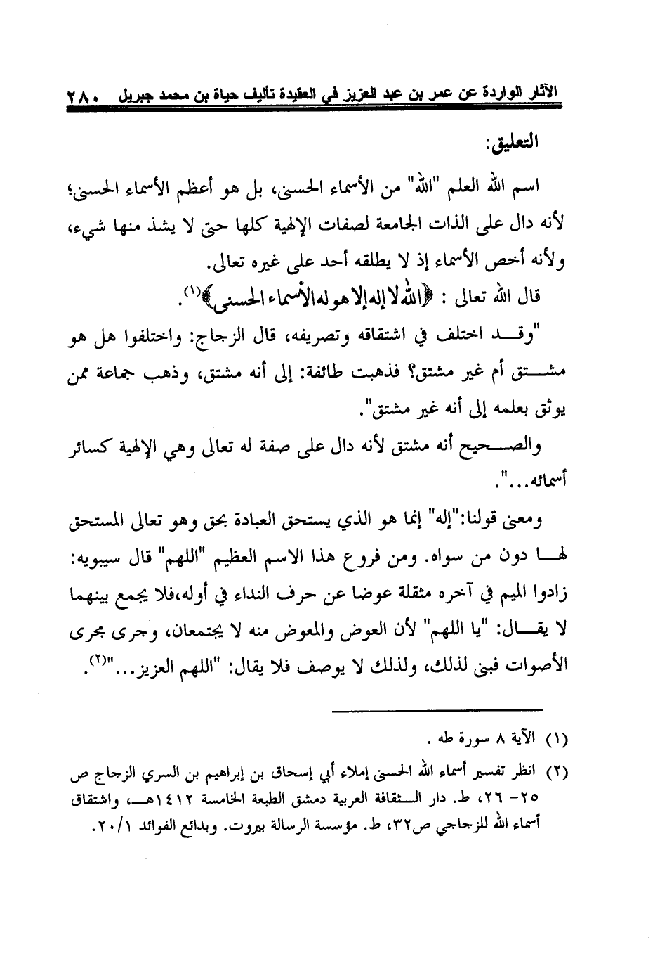 2 انظر تفسير أسماء الله الحسنى إملاء أبي إسحاق بن إبراهيم بن السري الزجاج ص25- 26، ط. دار الثقافة العربية دمشق الطبعة الخامسة 1412هـ، واشتقاق أسماء الله للزجاجي ص32، ط. مؤسسة الرسالة بيروت. وبدائع الفوائد 1/20.