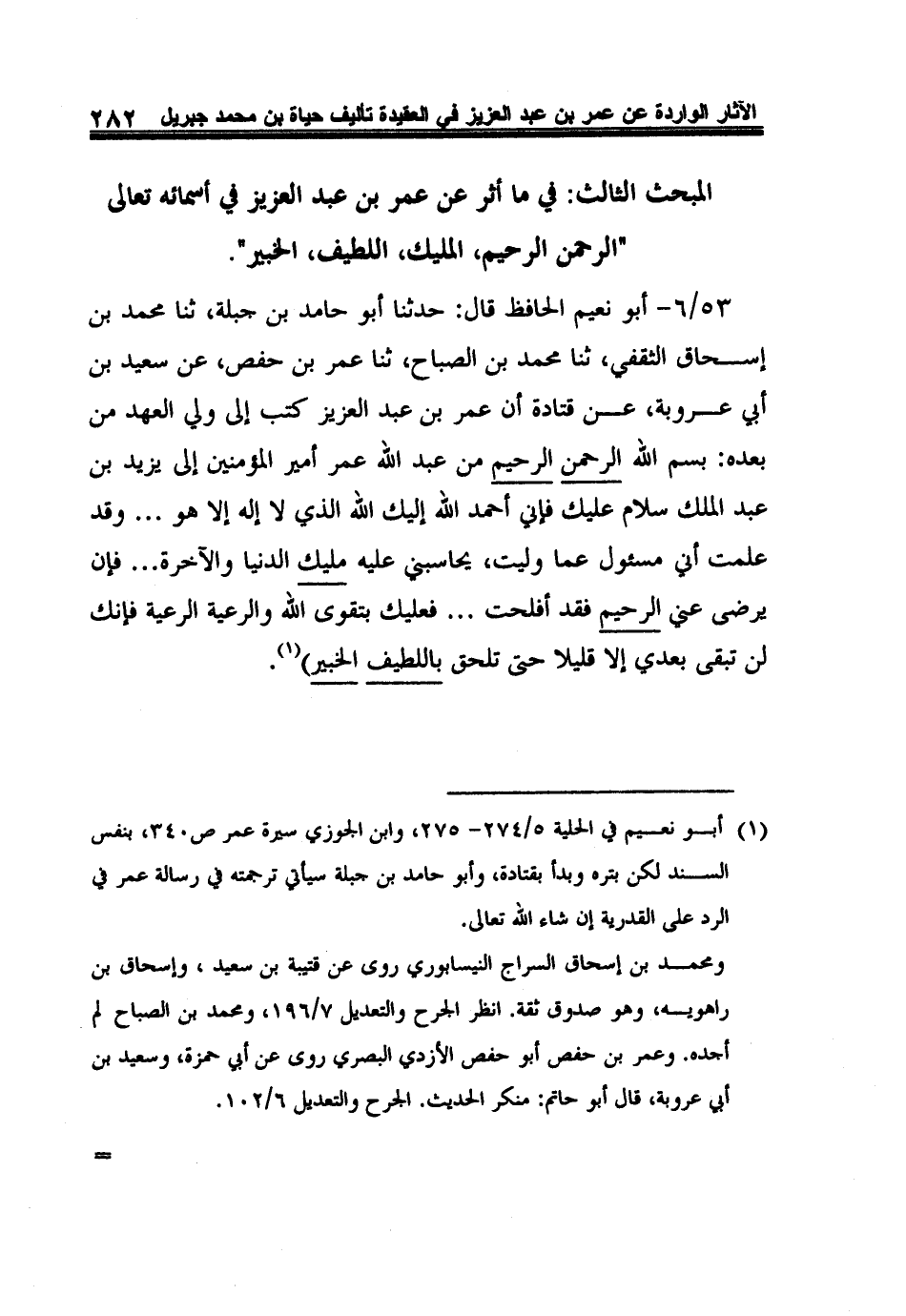 1 أبو نعيم في الحلية 5/274- 275، وابن الجوزي سيرة عمر ص340، بنفس السند لكن بتره وبدأ بقتادة، وأبو حامد بن جبلة سيأتي ترجمته في رسالة عمر في الرد على القدرية إن شاء الله تعالى.