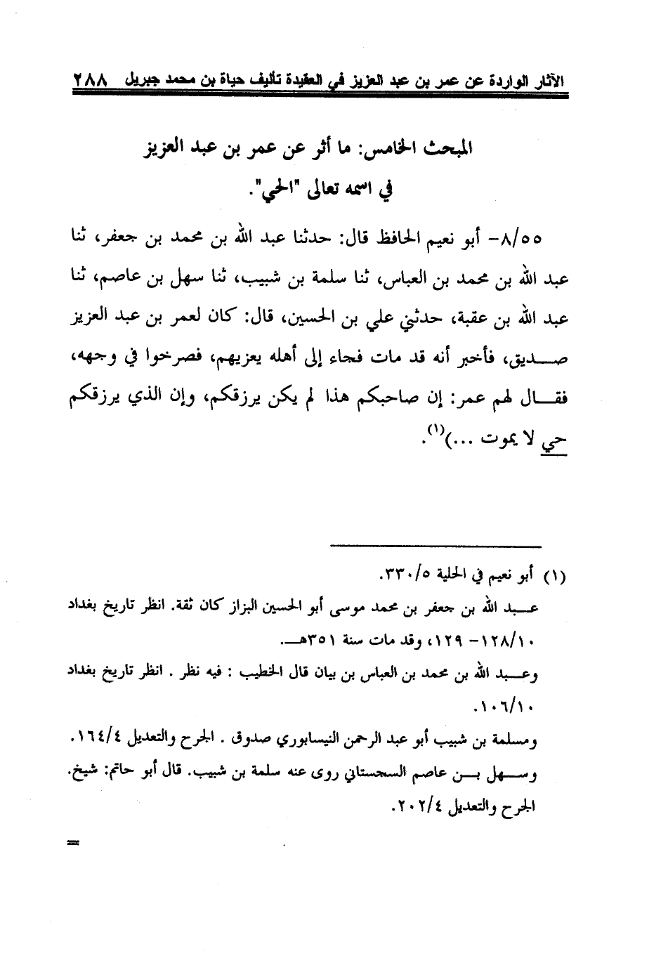 55/8- أبو نعيم الحافظ قال: حدثنا عبد الله بن محمد بن جعفر، ثنا عبد الله بن محمد بن العباس، ثنا سلمة بن شبيب، ثنا سهل بن عاصم، ثنا عبد الله بن عقبة، حدثني علي بن الحسين، قال: كان لعمر بن عبد العزيز صديق، فأخبر أنه قد مات فجاء إلى أهله يعزيهم، فصرخوا في وجهه، فقال لهم عمر: "إن صاحبكم هذا لم يكن يرزقكم، وإن الذي يرزقكم حي لا يموت ... "1.