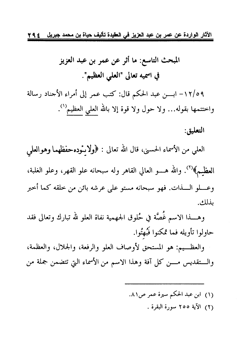 المبحث التاسع: ما أثر عن عمر بن عبد العزيز في اسمه تعالى"العلي العظيم"