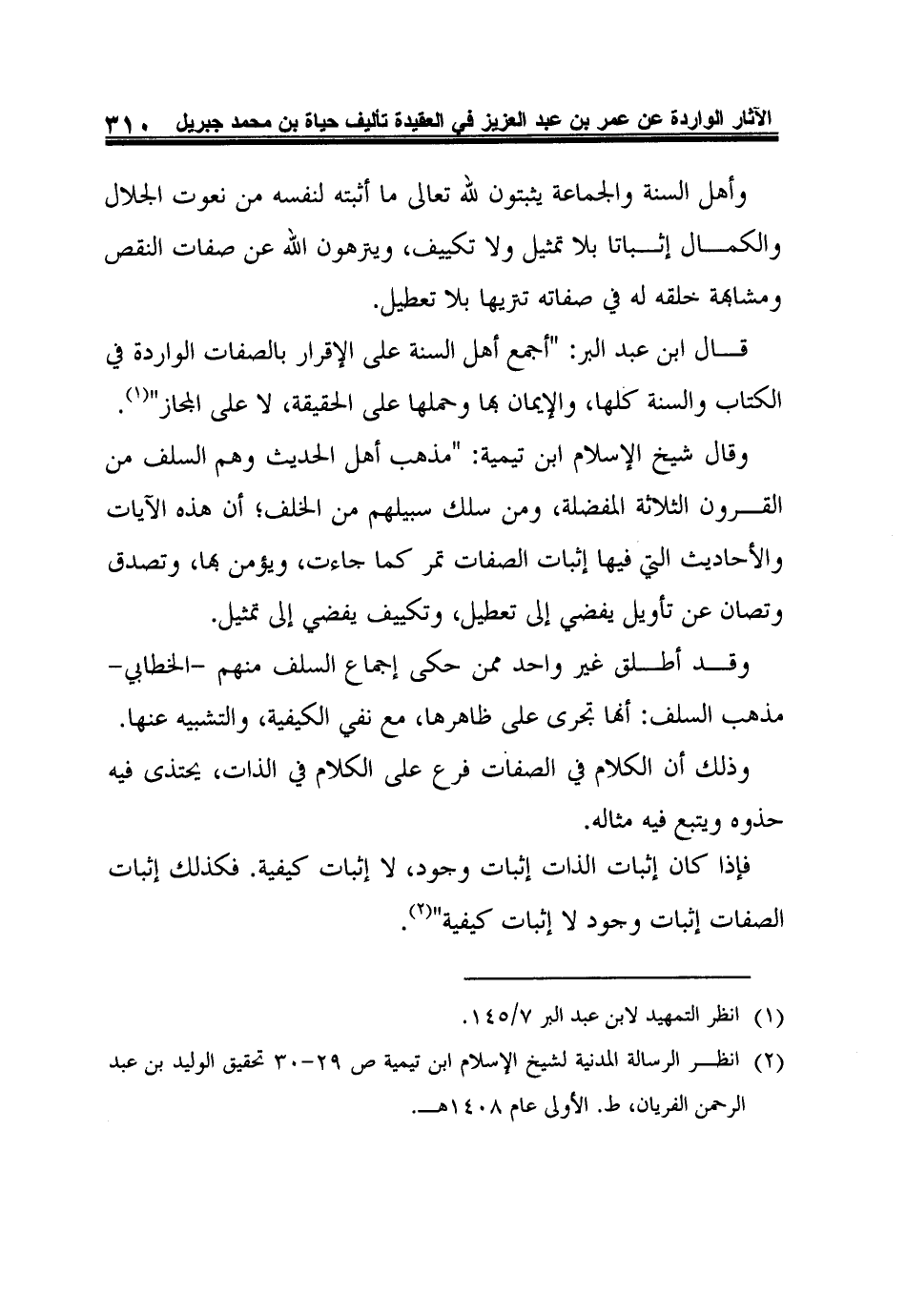 قال ابن عبد البر: "أجمع أهل السنة على الإقرار بالصفات الواردة في الكتاب والسنة كلها، والإيمان بها وحملها على الحقيقة، لا على المجاز"1.