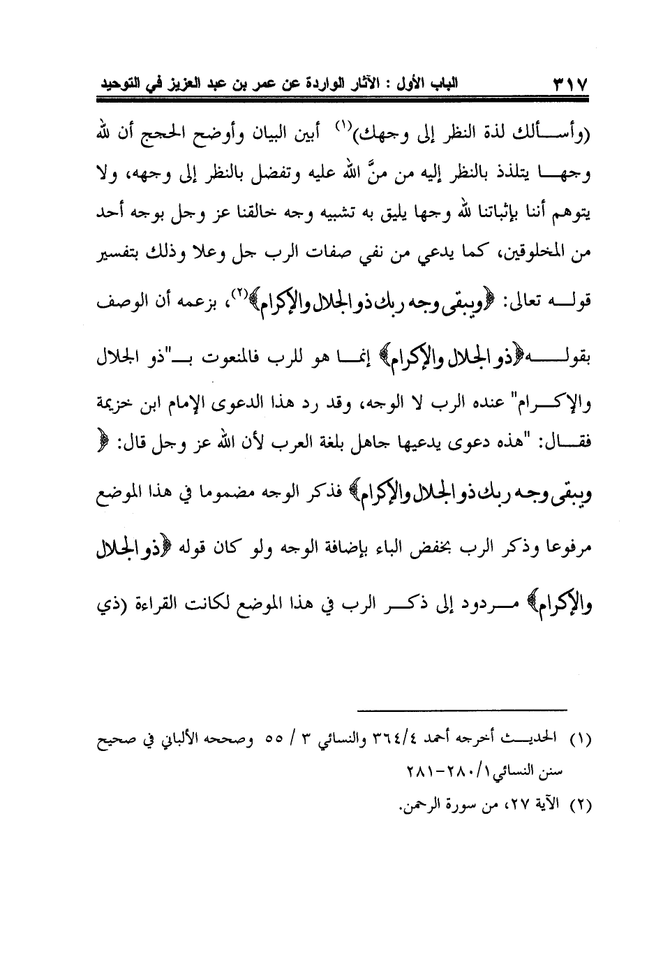 "وأسألك لذة النظر إلى وجهك"1 أبين البيان وأوضح الحجج أن لله وجها يتلذذ بالنظر إليه من منَّ الله عليه وتفضل بالنظر إلى وجهه، ولا يتوهم أننا بإثباتنا لله وجها يليق به تشبيه وجه خالقنا عز وجل بوجه أحد من المخلوقين، كما يدعي من نفي صفات الرب جل وعلا وذلك بتفسير قوله تعالى: {وَيَبْقَى وَجْهُ رَبِّكَ ذُو الْجَلالِ وَالإِكْرَامِ} 2، بزعمه أن الوصف بقوله: {ذُو الْجَلالِ وَالإِكْرَامِ} إنما هو للرب فالمنعوت بـ"ذو الجلال والإكرام" عنده الرب لا الوجه، وقد رد هذا الدعوى الإمام ابن خزيمة فقال: "هذه دعوى يدعيها جاهل بلغة العرب لأن الله عز وجل قال: {وَيَبْقَى وَجْهُ رَبِّكَ ذُو الْجَلالِ وَالإِكْرَامِ} فذكر الوجه مضموما في هذا الموضع مرفوعا وذكر الرب بخفض الباء بإضافة الوجه ولو كان قوله {ذُو الْجَلالِ وَالإِكْرَامِ} مردود إلى ذكر الرب في هذا الموضع لكانت القراءة "ذي