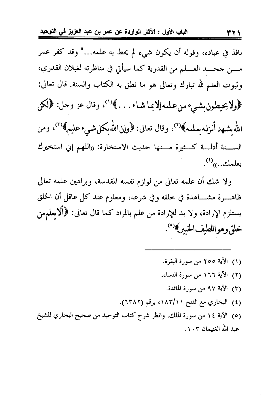 نافذ في عباده، وقوله: أن يكون شيء لم يحط به علمه ... " وقد كفر عمر من جحد العلم من القدرية كما سيأتي في مناظرته لغيلان القدري، وثبوت العلم لله تبارك وتعالى هو ما نطق به الكتاب والسنة. قال تعالى: {وَلا يُحِيطُونَ بِشَيْءٍ مِنْ عِلْمِهِ إِلاَّ بِمَا شَاءَ ... } 1، وقال عز وجل: {لَكِنِ اللَّهُ يَشْهَدُ بِمَا أَنْزَلَ إِلَيْكَ أَنْزَلَهُ بِعِلْمِهِ} 2، وقال تعالى: {إِنَّ اللَّهَ بِكُلِّ شَيْءٍ عَلِيمٌ} 3، ومن السنة أدلة كثيرة منها حديث الاستخارة: "اللهم إني استخيرك بعلمك.."4.