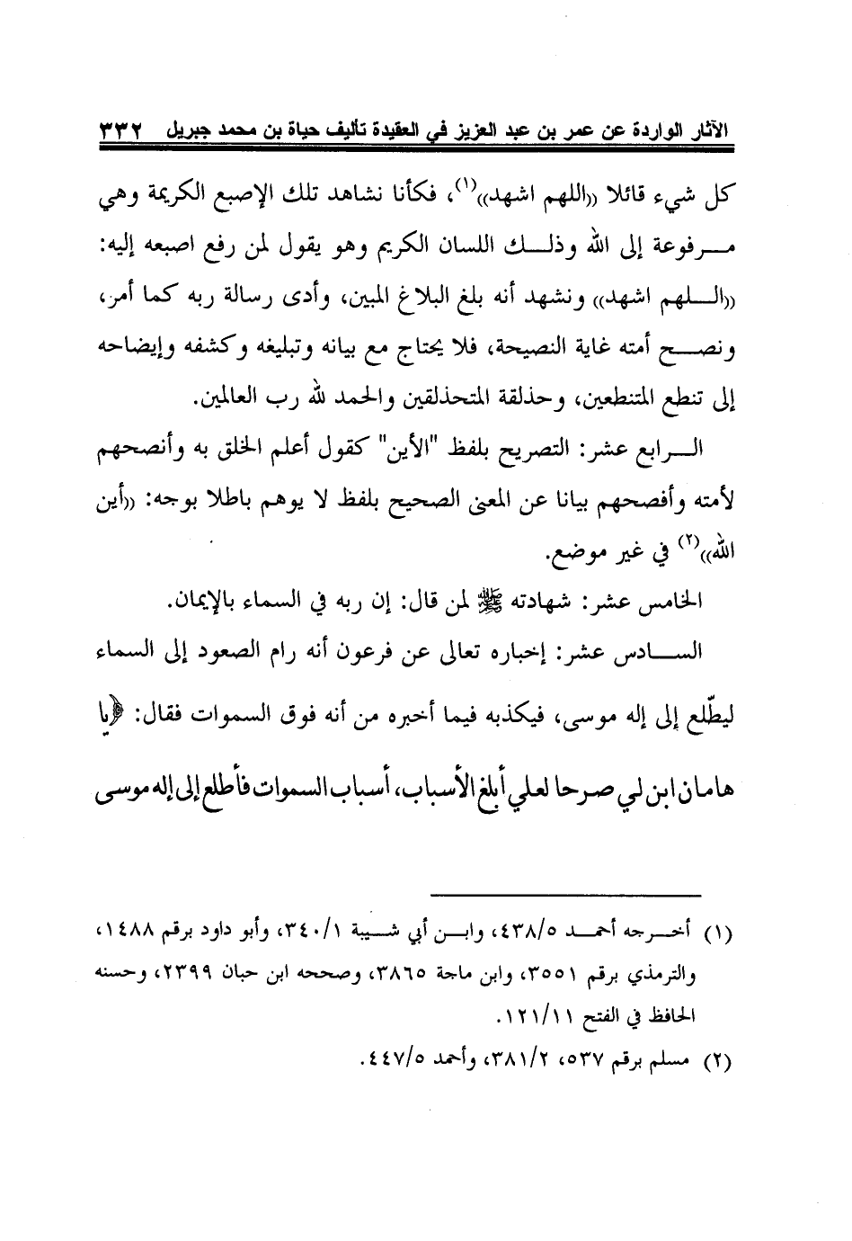 كل شيء قائلا: "اللهم اشهد"1، فكأنا نشاهد تلك الإصبع الكريمة وهي مرفوعة إلى الله وذلك اللسان الكريم وهو يقول لمن رفع اصبعه إليه: "اللهم اشهد" ونشهد أنه بلغ البلاغ المبين، وأدى رسالة ربه كما أمر، ونصح أمته غاية النصيحة، فلا يحتاج مع بيانه وتبليغه وكشفه وإيضاحه إلى تنطع المتنطعين، وحذلقة المتحذلقين والحمد لله رب العالمين.