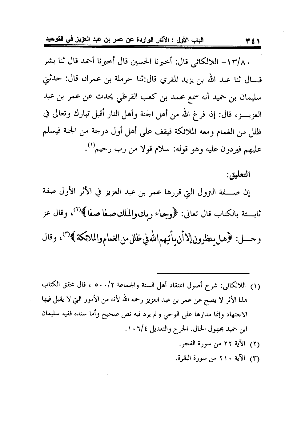 1 اللالكائى: شرح أصول اعتقاد أهل السنة والجماعة 2/500، قال محقق الكتاب هذا الأثر لا يصح عن عمر بن عبد العزيز رحمه الله لأنه من الأمور التي لا يقبل فيها الاجتهاد وإنما مدارها على الوحي ولم يرد فيه نص صحيح وأما سنده ففيه سليمان ابن حميد مجهول الحال. الجرح والتعديل 4/106.