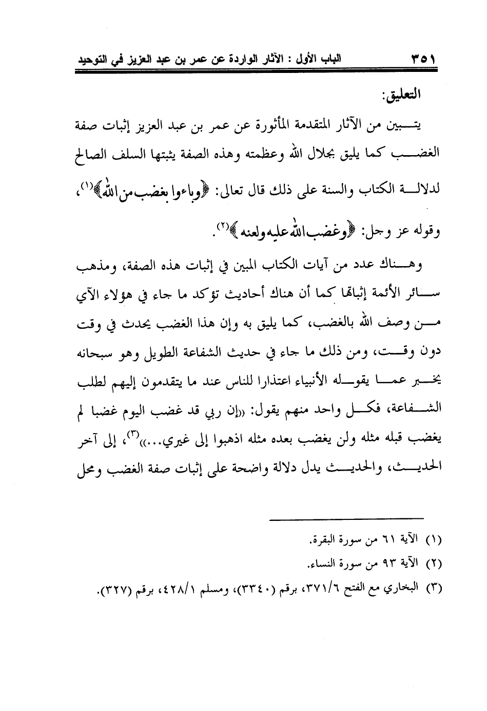 يتبين من الآثار المتقدمة المأثورة عن عمر بن عبد العزيز إثبات صفة الغضب كما يليق بجلال الله وعظمته وهذه الصفة يثبتها السلف الصالح لدلالة الكتاب والسنة على ذلك قال تعالى: {وَبَاءُوا بِغَضَبٍ مِنَ اللَّهِ} 1، وقوله عز وجل: {وَغَضِبَ اللَّهُ عَلَيْهِ وَلَعَنَهُ} 2.