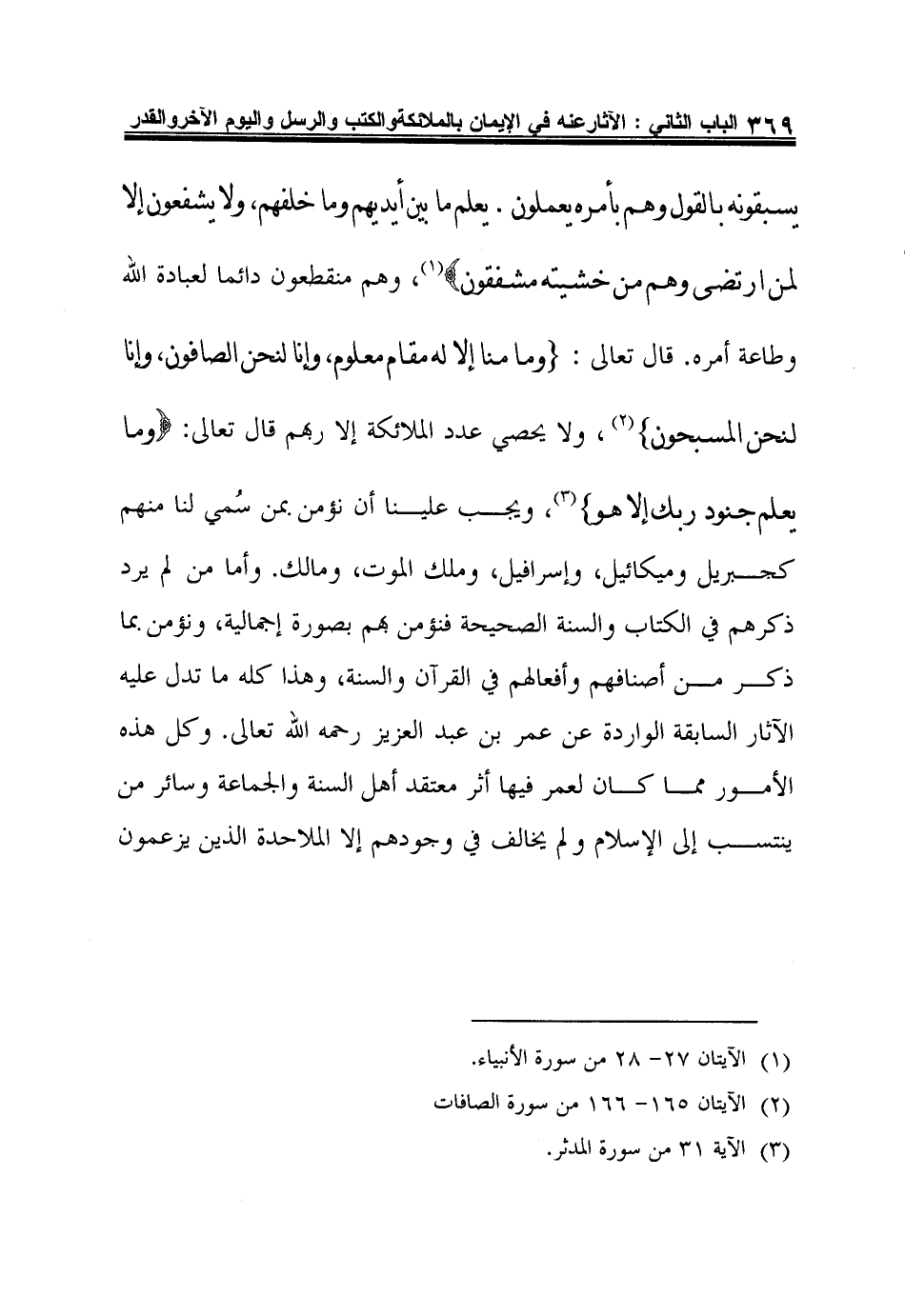 يَسْبِقُونَهُ بِالْقَوْلِ وَهُمْ بِأَمْرِهِ يَعْمَلُون. يَعْلَمُ مَا بَيْنَ أَيْدِيهِمْ وَمَا خَلْفَهُمْ وَلا يَشْفَعُونَ إِلاَّ لِمَنِ ارْتَضَى وَهُمْ مِنْ خَشْيَتِهِ مُشْفِقُونَ} 1، وهم منقطعون دائما لعبادة الله وطاعة أمره. قال تعالى: {وَمَا مِنَّا إِلاَّ لَهُ مَقَامٌ مَعْلُومٌ وَإِنَّا لَنَحْنُ الصَّافُّونَ وَإِنَّا لَنَحْنُ الْمُسَبِّحُونَ} 2، ولا يحصي عدد الملائكة إلا ربهم قال تعالى: {وَمَا يَعْلَمُ جُنُودَ رَبِّكَ إِلاَّ هُوَ} 3، ويجب علينا أن نؤمن بمن سُمي لنا منهم كجبريل وميكائيل، وإسرافيل، وملك الموت، ومالك. وأما من لم يرد ذكرهم في الكتاب والسنة الصحيحة فنؤمن بهم بصورة إجمالية، ونؤمن بما ذكر من أصنافهم وأفعالهم في القرآن والسنة، وهذا كله ما تدل عليه الآثار السابقة الواردة عن عمر بن عبد العزيز رحمه الله تعالى. وكل هذه الأمور مما كان لعمر فيها أثر معتقد أهل السنة والجماعة وسائر من ينتسب إلى الإسلام ولم يخالف في وجودهم إلا الملاحدة الذين يزعمون