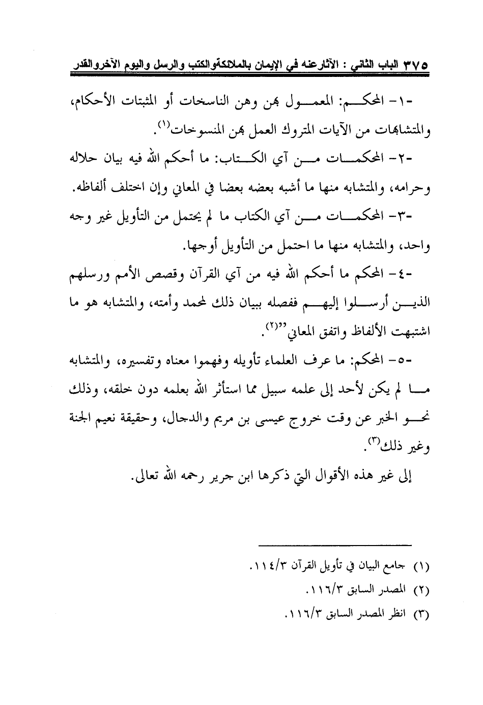 -3المحكمات من آي الكتاب ما لم يحتمل من التأويل غير وجه واحد، والمتشابه منها ما احتمل من التأويل أوجها.