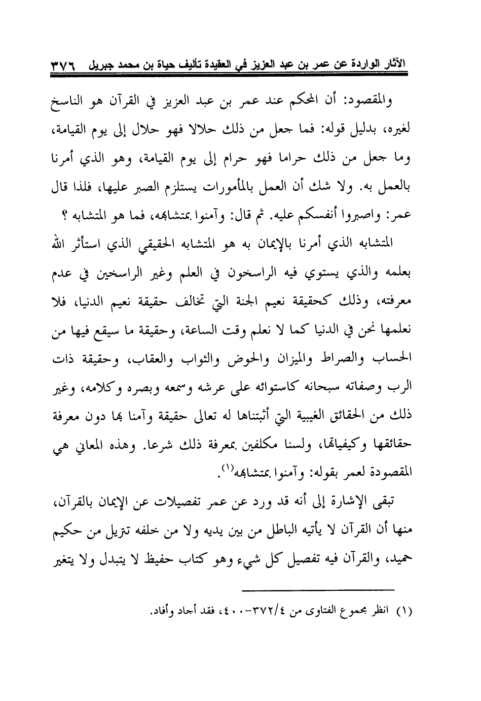 والمقصود: أن المحكم عند عمر بن عبد العزيز في القرآن هو الناسخ لغيره، بدليل قوله: فما جعل من ذلك حلالا فهو حلال إلى يوم القيامة، وما جعل من ذلك حراما فهو حرام إلى يوم القيامة، وهو الذي أمرنا بالعمل به. ولا شك أن العمل بالمأمورات يستلزم الصبر عليها، فلذا قال عمر: واصبروا أنفسكم عليه. ثم قال: وآمنوا بمتشابهه، فما هو المتشابه؟