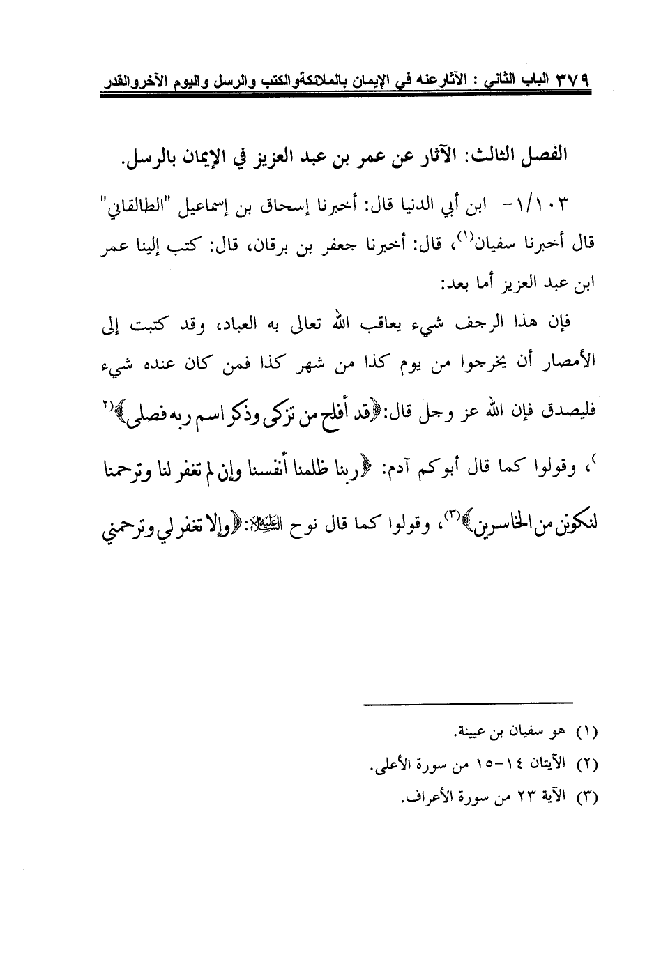 الفصل الثالث: الآثار عن عمر بن عبد العزيز في الإيمان بالرسل.