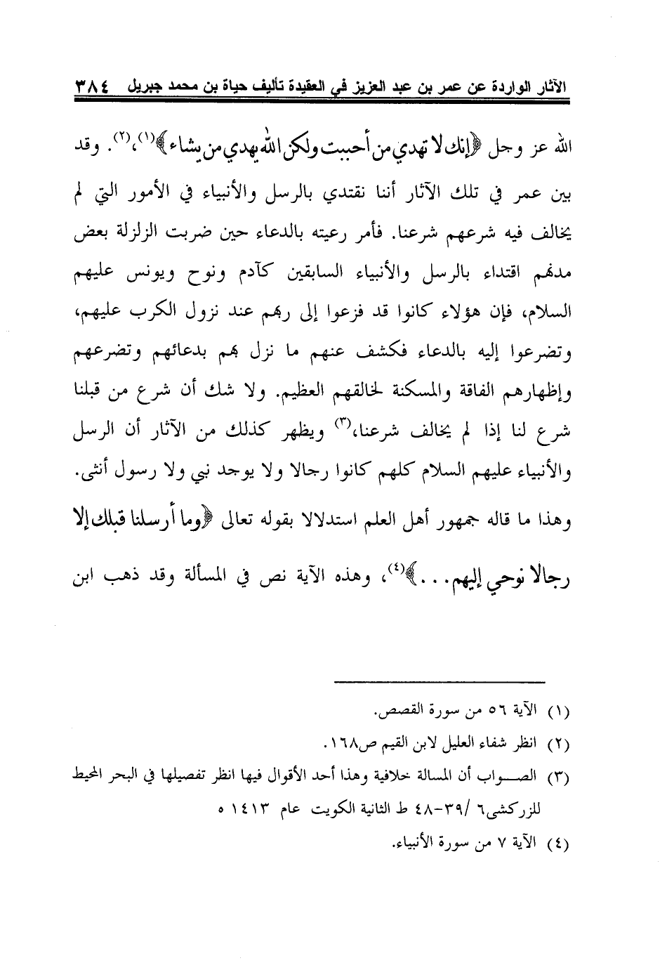 الله عز وجل: {إِنَّكَ لا تَهْدِي مَنْ أَحْبَبْتَ وَلَكِنَّ اللَّهَ يَهْدِي مَنْ يَشَاء} 1،2. وقد بين عمر في تلك الآثار أننا نقتدي بالرسل والأنبياء في الأمور التي لم يخالف فيه شرعهم شرعنا. فأمر رعيته بالدعاء حين ضربت الزلزلة بعض مدنهم اقتداء بالرسل والأنبياء السابقين كآدم ونوح ويونس عليهم السلام، فإن هؤلاء كانوا قد فزعوا إلى ربهم عند نزول الكرب عليهم، وتضرعوا إليه بالدعاء فكشف عنهم ما نزل بهم بدعائهم وتضرعهم وإظهارهم الفاقة والمسكنة لخالقهم العظيم. ولا شك أن شرع من قبلنا شرع لنا إذا لم يخالف شرعنا،3 ويظهر كذلك من الآثار أن الرسل والأنبياء عليهم السلام كلهم كانوا رجالا ولا يوجد نبي ولا رسول أنثى. وهذا ما قاله جمهور أهل العلم استدلالا بقوله تعالى: {وَمَا أَرْسَلْنَا قَبْلَكَ إِلاَّ رِجَالاً نُوحِي إِلَيْهِم ... } 4، وهذه الآية نص في المسألة وقد ذهب ابن