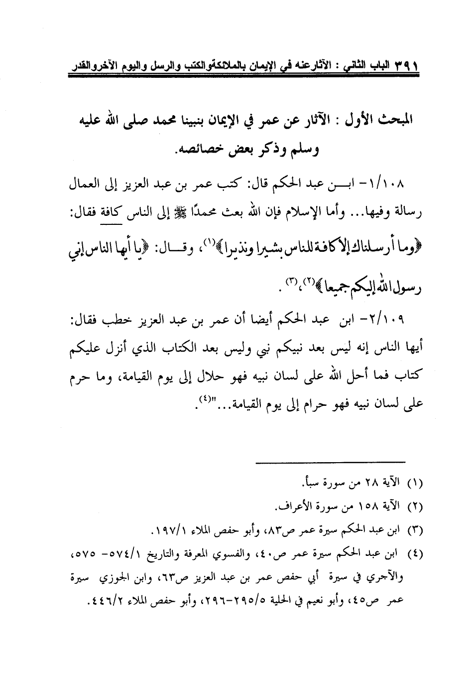 108/1- ابن عبد الحكم قال: كتب عمر بن عبد العزيز إلى العمال رسالة وفيها ... وأما الإسلام فإن الله بعث محمدًا صلى الله عليه وسلم إلى الناس كافة فقال: {وَمَا أَرْسَلْنَاكَ إِلاَّ كَافَّةً لِلنَّاسِ بَشِيراً وَنَذِيراً} 1، وقال: {يَا أَيُّهَا النَّاسُ إِنِّي رَسُولُ اللَّهِ إِلَيْكُمْ جَمِيعاً} 2،3.