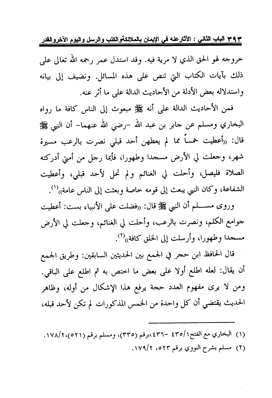 خروجه لهو الحق الذي لا مرية فيه. وقد استدل عمر رحمه الله تعالى على ذلك بآيات الكتاب التي تنص على هذه المسائل. ونضيف إلى بيانه واستدلاله بعض الأدلة من الأحاديث الدالة على ما أثر عنه.