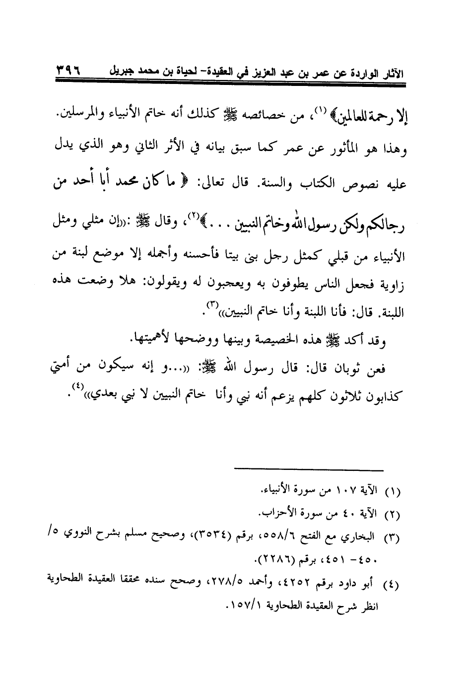 إِلَّا رَحْمَةً لِلْعَالَمِينَ} 1، من خصائصه صلى الله عليه وسلم كذلك أنه خاتم الأنبياء والمرسلين. وهذا هو المأثور عن عمر كما سبق بيانه في الأثر الثاني وهو الذي يدل عليه نصوص الكتاب والسنة. قال تعالى: {مَا كَانَ مُحَمَّدٌ أَبَا أَحَدٍ مِنْ رِجَالِكُمْ وَلَكِنْ رَسُولَ اللَّهِ وَخَاتَمَ النَّبِيِّين ... } 2، وقال صلى الله عليه وسلم: "إن مثلي ومثل الأنبياء من قبلي كمثل رجل بنى بيتا فأحسنه وأجمله إلا موضع لبنة من زاوية فجعل الناس يطوفون به ويعجبون له ويقولون: هلا وضعت هذه اللبنة. قال: فأنا اللبنة وأنا خاتم النبيين"3.