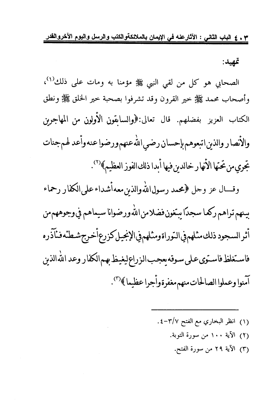 الصحابي هو كل من لقي النبي صلى الله عليه وسلم مؤمنا به ومات على ذلك1، وأصحاب محمد صلى الله عليه وسلم خير القرون وقد تشرفوا بصحبة خير الخلق صلى الله عليه وسلم ونطق الكتاب العزيز بفضلهم. قال تعالى: {وَالسَّابِقُونَ الأَوَّلُونَ مِنَ الْمُهَاجِرِينَ وَالْأَنْصَارِ وَالَّذِينَ اتَّبَعُوهُمْ بِإِحْسَانٍ رَضِيَ اللَّهُ عَنْهُمْ وَرَضُوا عَنْهُ وَأَعَدَّ لَهُمْ جَنَّاتٍ تَجْرِي تَحْتَهَا الأَنْهَارُ خَالِدِينَ فِيهَا أَبَداً ذَلِكَ الْفَوْزُ الْعَظِيمُ} 2.