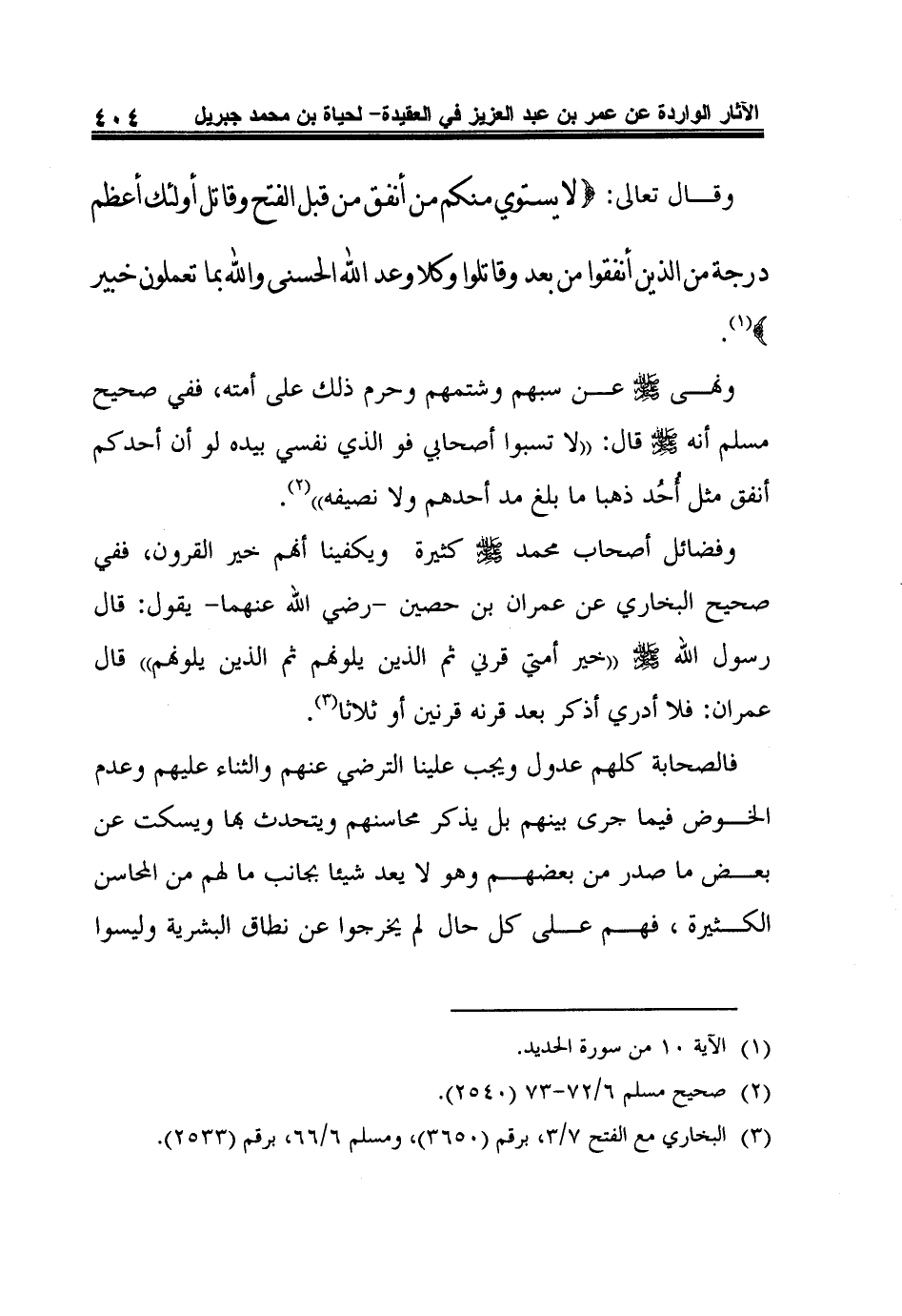 ونهى صلى الله عليه وسلم عن سبهم وشتمهم وحرم ذلك على أمته، ففي صحيح مسلم أنه صلى الله عليه وسلم قال: "لا تسبوا أصحابي فو الذي نفسي بيده لو أن أحدكم أنفق مثل أُحُد ذهبا ما بلغ مد أحدهم ولا نصيفه"2.
