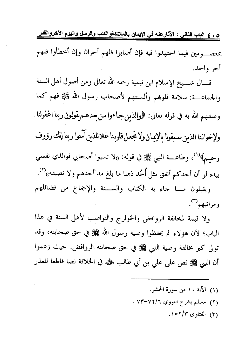 قال شيخ الإسلام ابن تيمية رحمه الله تعالى ومن أصول أهل السنة والجماعة: سلامة قلوبهم وألسنتهم لأصحاب رسول الله صلى الله عليه وسلم فهم كما وصفهم الله به في قوله تعالى: {وَالَّذِينَ جَاءُوا مِنْ بَعْدِهِمْ يَقُولُونَ رَبَّنَا اغْفِرْ لَنَا وَلإِخْوَانِنَا الَّذِينَ سَبَقُونَا بِالإِيمَانِ وَلا تَجْعَلْ فِي قُلُوبِنَا غِلاً لِلَّذِينَ آمَنُوا رَبَّنَا إِنَّكَ رَؤُوفٌ رَحِيمٌ} 1، وطاعة النبي صلى الله عليه وسلم في قوله: "لا تسبوا أصحابي فوالذي نفسي بيده لو أن أحدكم أنفق مثل أُحُد ذهبا ما بلغ مد أحدهم ولا نصيفه"2.