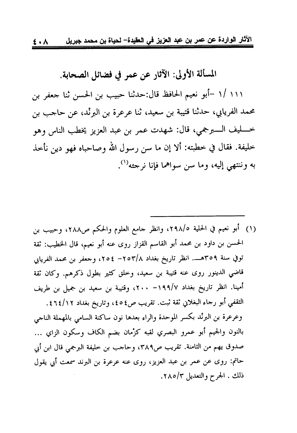 111 /1 - أبو نعيم الحافظ قال: حدثنا حبيب بن الحسن ثنا جعفر بن محمد الفريابي، حدثنا قتيبة بن سعيد، ثنا عرعرة بن البرنْد، عن حاجب بن خليف البرجمي، قال: شهدت عمر بن عبد العزيز يخطب الناس وهو خليفة. فقال في خطبته: ألا إن ما سن رسول الله وصاحباه فهو دين نأخذ به وننتهي إليه، وما سن سواهما فإنا نرجئه1.