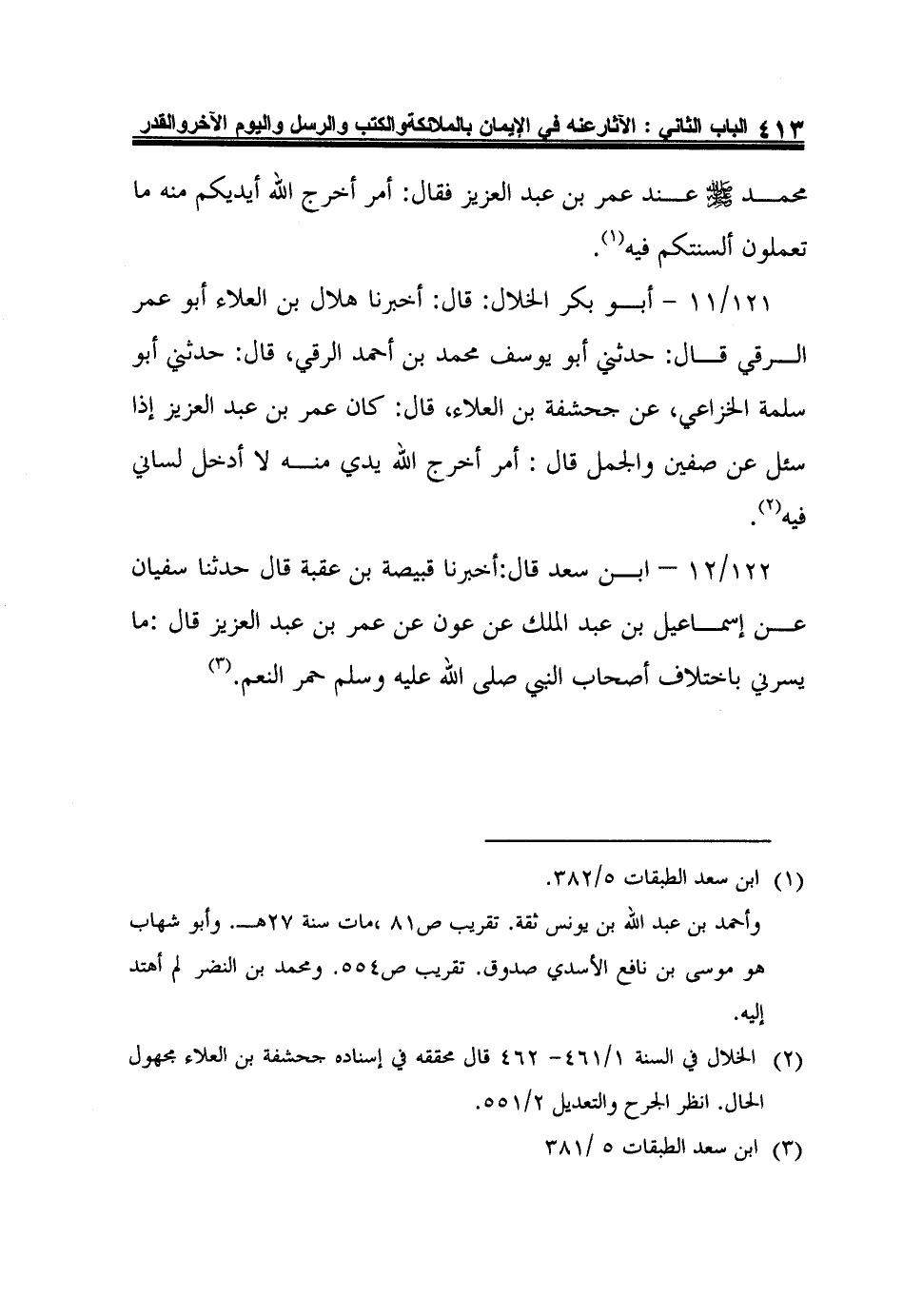 121/11 - أبو بكر الخلال: قال: أخبرنا هلال بن العلاء أبو عمر الرقي قال: حدثني أبو يوسف محمد بن أحمد الرقي، قال: حدثني أبو سلمة الخزاعي، عن جحشفة بن العلاء، قال: كان عمر بن عبد العزيز إذا سئل عن صفين والجمل قال: أمر أخرج الله يدي منه لا أدخل لساني فيه2.