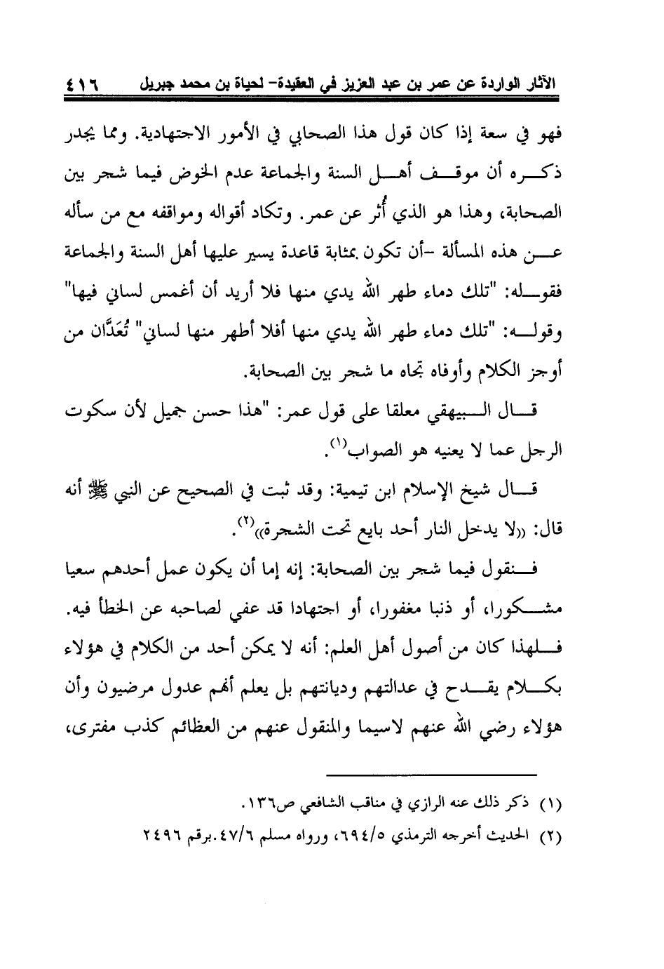 فهو في سعة إذا كان قول هذا الصحابي في الأمور الاجتهادية. ومما يجدر ذكره أن موقف أهل السنة والجماعة عدم الخوض فيما شجر بين الصحابة، وهذا هو الذي أُثر عن عمر. وتكاد أقواله ومواقفه مع من سأله عن هذه المسألة - أن تكون بمثابة قاعدة يسير عليها أهل السنة والجماعة فقوله: "تلك دماء طهر الله يدي منها فلا أريد أن أغمس لساني فيها" وقوله: "تلك دماء طهر الله يدي منها أفلا أطهر منها لساني" تُعَدَّان من أوجز الكلام وأوفاه تجاه ما شجر بين الصحابة.