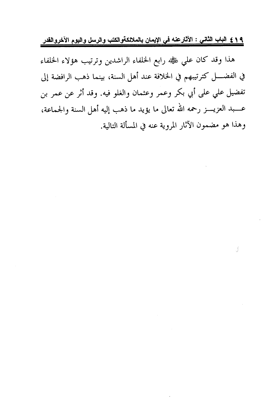 هذا وقد كان علي رضي الله عنه رابع الخلفاء الراشدين وترتيب هؤلاء الخلفاء في الفضل كترتيبهم في الخلافة عند أهل السنة، بينما ذهب الرافضة إلى تفضيل علي على أبي بكر وعمر وعثمان والغلو فيه. وقد أثر عن عمر بن عبد العزيز رحمه الله تعالى ما يؤيد ما ذهب إليه أهل السنة والجماعة، وهذا هو مضمون الآثار المروية عنه في المسألة التالية.
