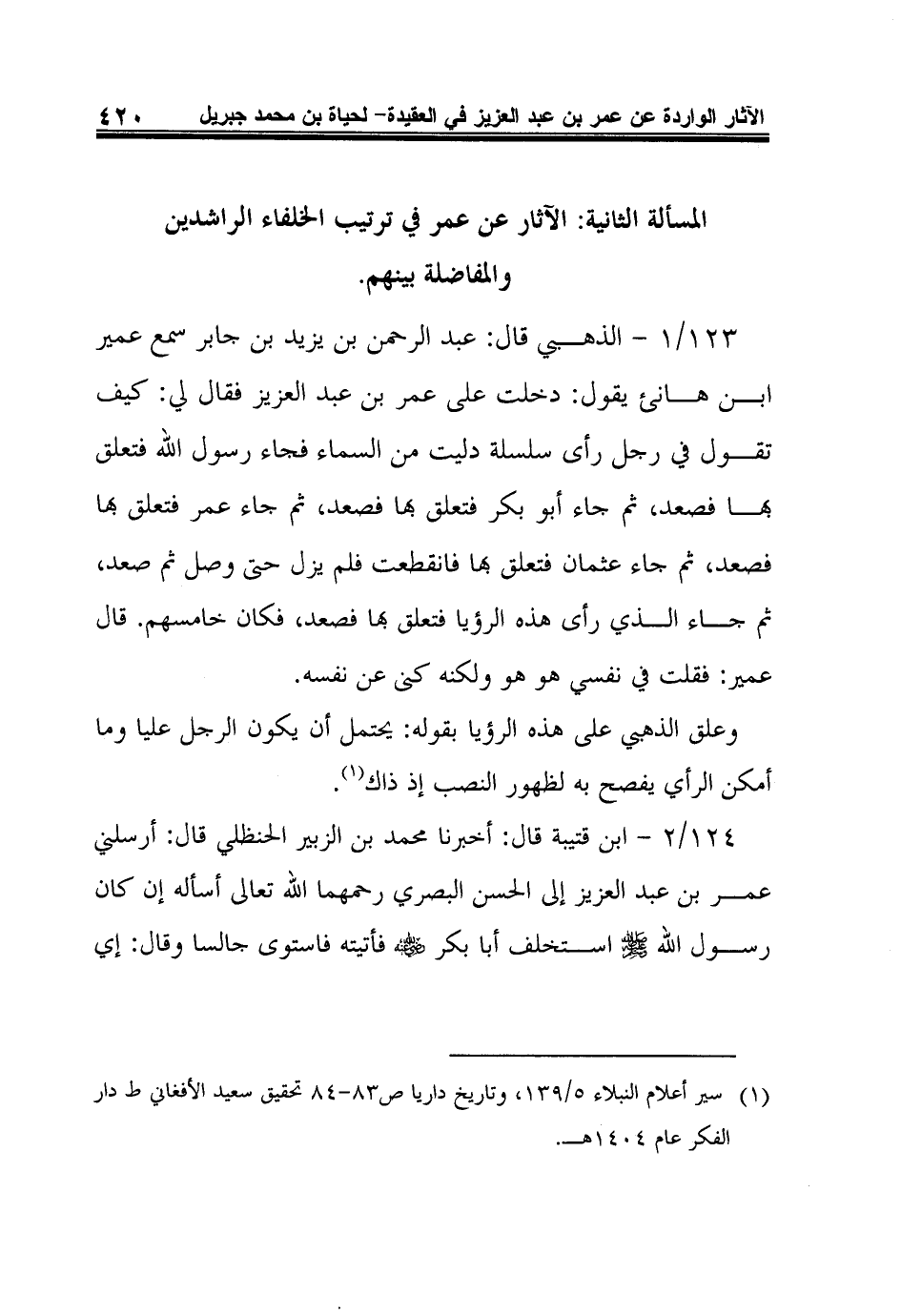 المسألة الثانية: الآثار عن عمر في ترتيب الخلفاء الراشدين والمفاضلة بينهم.
