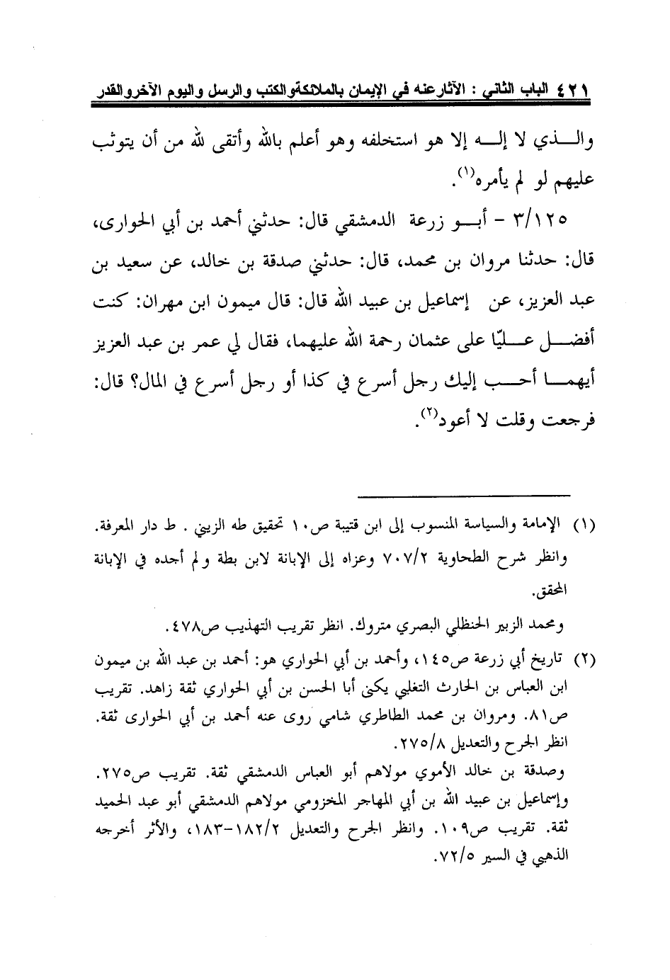 125/3 - أبو زرعة الدمشقي قال: حدثني أحمد بن أبي الحوارى، قال: حدثنا مروان بن محمد، قال: حدثني صدقة بن خالد، عن سعيد بن عبد العزيز، عن إسماعيل بن عبيد الله قال: قال ميمون ابن مهران: كنت أفضل عليّا على عثمان رحمة الله عليهما، فقال لي عمر بن عبد العزيز أيهما أحب إليك رجل أسرع في كذا أو رجل أسرع في المال؟ قال: فرجعت وقلت لا أعود2.
