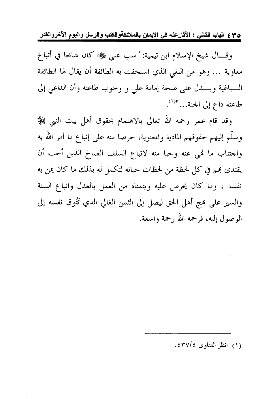 وقال شيخ الإسلام ابن تيمية:"سب علي رضي الله عنه كان شائعا في أتباع معاوية ... وهو من البغي الذي استحقت به الطائفة أن يقال لها الطائفة الباغية ويدل على صحة إمامة علي ووجوب طاعته وأن الداعي إلى طاعته داع إلى الجنة ... "1.